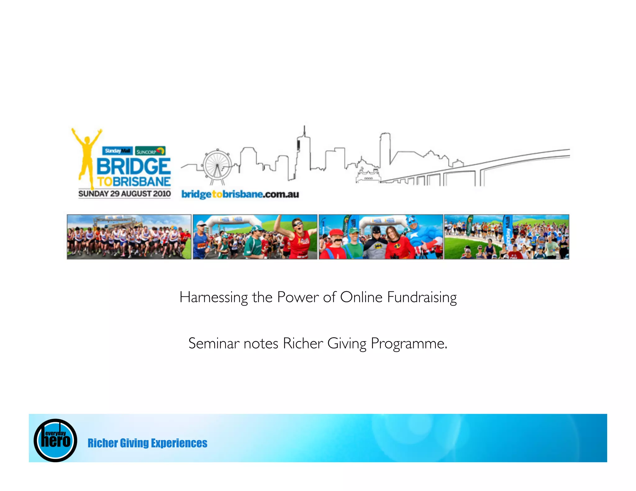 This document discusses harnessing the power of online fundraising through a three-step "Richer Giving Programme". The steps include acquisition to recruit more fundraisers, activation to engage supporters and increase funds raised through communications, and conversion to thank donors and encourage ongoing support of the charity's cause. Specific tactics described include social media sharing of fundraising pages, regular email updates, and thanking peer donors. The overall goal is to grow the number and engagement of fundraisers to maximize funds raised for the charity.