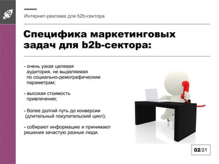 Документ описывает специфику интернет-рекламы для B2B-сектора, акцентируя внимание на узкой целевой audience и длинном покупательском цикле. Основные цели рекламы включают получение заказов и развитие дилерской сети, с акцентом на важность контекстной рекламы и размещения на тематических порталах. Привлечение трафика достигается через различные стратегии, включая ремаркетинг и email-маркетинг, с целью повышения конверсии и удержания аудитории.