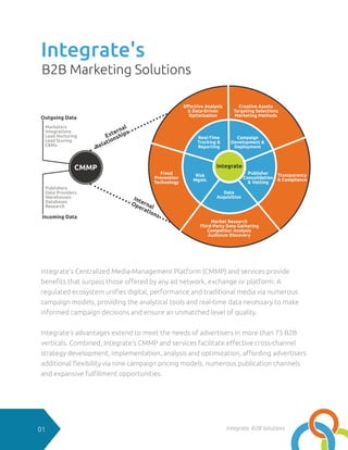 Integrate provides B2B marketing solutions including strategy development, implementation, and optimization. Their services include custom campaign offerings with flexible pricing models and targeting, as well as analytical tools and real-time reporting for tracking performance. Integrate aims to streamline the media buying process and facilitate effective cross-channel strategies through their centralized platform and dedicated support.