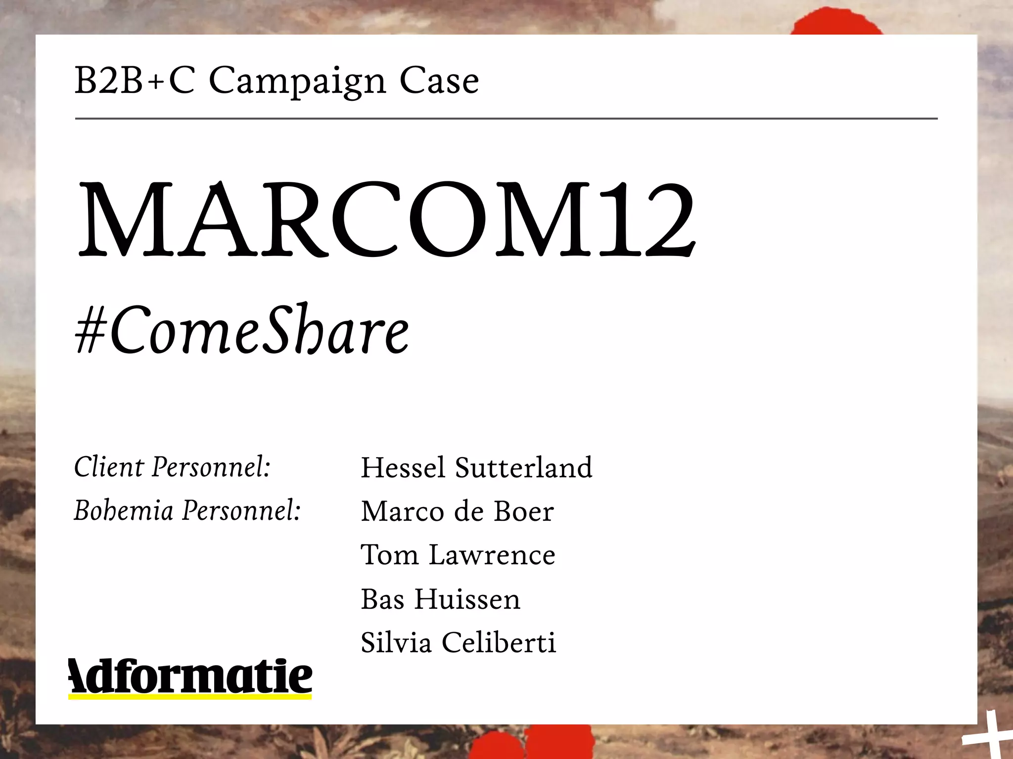 Kluwer's Adformatie organizes an annual MARCOM fair for marketing and communications professionals to set trends for the coming year. The 2012 fair theme is "It's Time for Sharing" (#ComeShare) to encourage attendees to share their knowledge through social media. The campaign aims to increase registrations to 15,000, visitors to 7,500, and exhibitors. Visual materials like leaflets, ads and banners promote MARCOM12 and the theme of sharing through the #komdelen hashtag. Results will be reported after the June 2012 event.