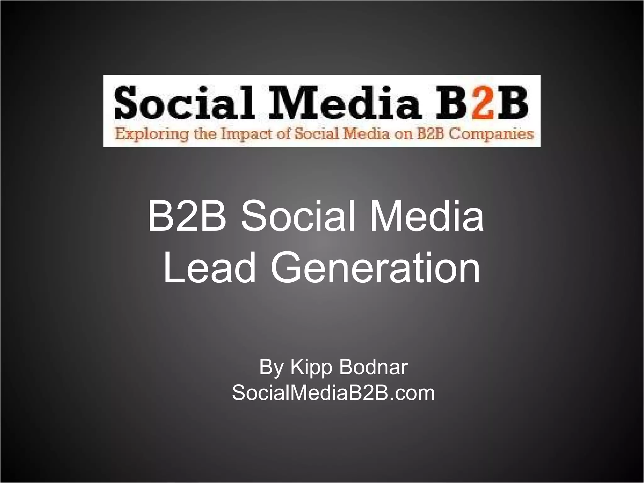 The document by Kipp Bodnar outlines strategies for B2B social media lead generation, emphasizing the importance of generating sales-driven actions and using inbound marketing techniques. It discusses the role of blogs, optimizing calls to action, leveraging platforms such as Facebook and email, and utilizing live events for capturing leads. For additional information, readers are encouraged to visit socialmediab2b.com.