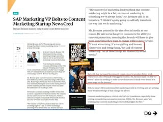 This document provides predictions for B2B marketing trends in 2015 from DirectionGroup. It identifies 10 key trends, including the return of emphasizing good ideas; focusing on high-quality over high-quantity content; using more humanized language; leveraging storytelling; shifting to paid content distribution and native advertising; mobile finally breaking through; expanding sales enablement; exploding marketing technology; increasing use of account-based marketing; and rising importance of visual content and video. The trends reflect an emphasis on content, technology, personalization and data-driven marketing approaches.