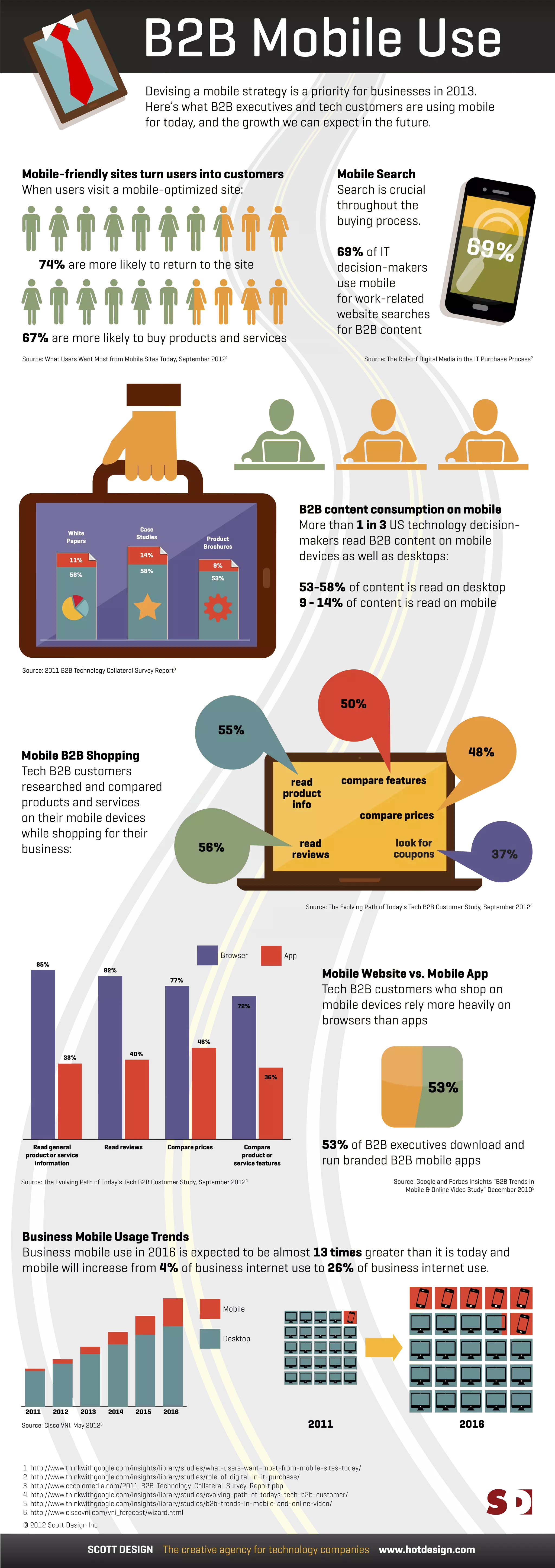 In 2013, businesses prioritize mobile strategy as B2B executives and tech customers increasingly use mobile for work-related activities, particularly for website searches and content consumption. Mobile-optimized sites improve user retention and purchasing likelihood, with a significant portion of tech decision-makers accessing B2B content via mobile devices. By 2016, mobile business use is projected to grow dramatically, indicating a shift in how businesses engage with technology online.