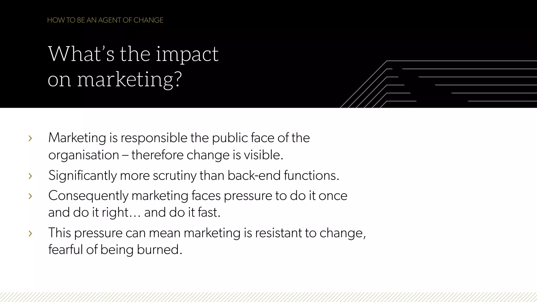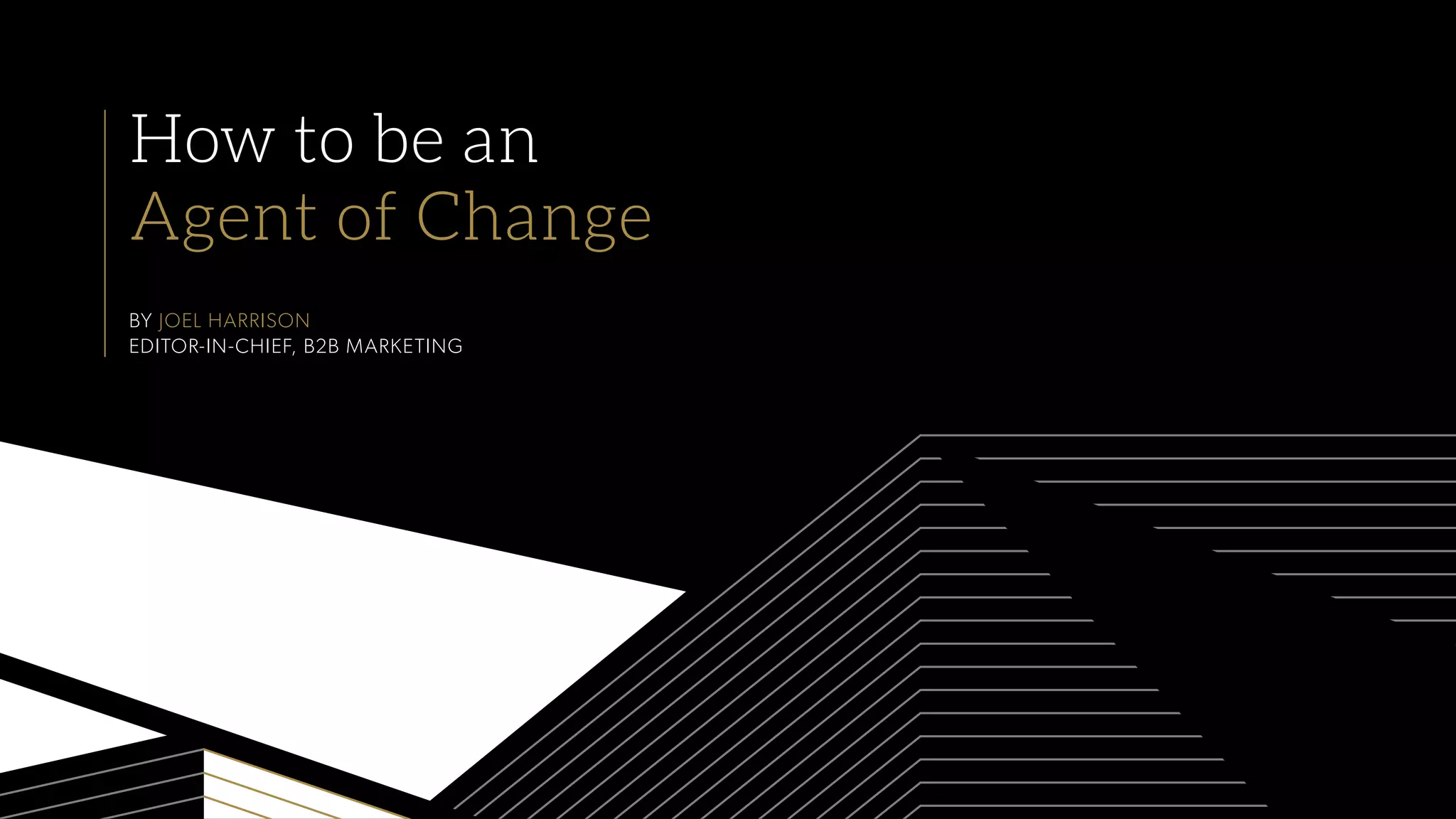 The document discusses how to be an effective agent of change in marketing. It conducted research that found marketing faces more pressure to change quickly than other departments. An agent of change proactively drives strategic change while bringing others along. Key characteristics of an effective change agent include being supportive, authentic, clear in communication, positive, and pragmatic/flexible. If one is not driving change, they risk being merely an enabler or even a victim of changes imposed on them. The document advocates that all marketers should aspire to be agents of change for their organizations.