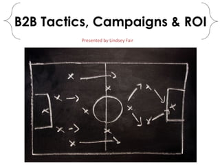 The document discusses various B2B marketing tactics including lead processing campaigns, drip campaigns, accelerator campaigns, and lead recycling campaigns. It emphasizes defining specific objectives and determining what constitutes success for a given B2B campaign. Campaigns should promote the total offering and have a clear call-to-action. The document also discusses typical B2B marketing budgets, calculating campaign ROI, and determining lifetime customer value.