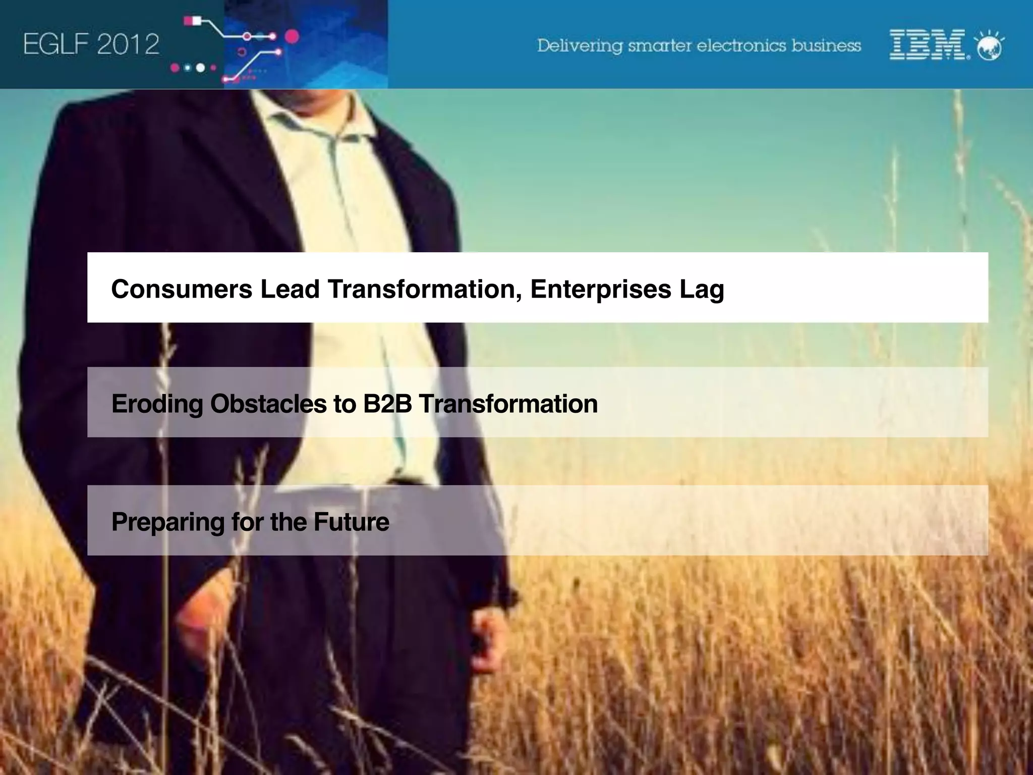 The document discusses the transformation in B2B electronics markets, highlighting that while consumers are quickly adopting new technologies, enterprises lag behind due to several barriers. Key insights include the shifting focus from products to services, the impact of analytics and online marketplaces on procurement, and the winner-take-all nature of transformed markets. As traditional impediments to change decline, organizations must adapt by aligning closely with customer needs to remain competitive in this rapidly evolving landscape.