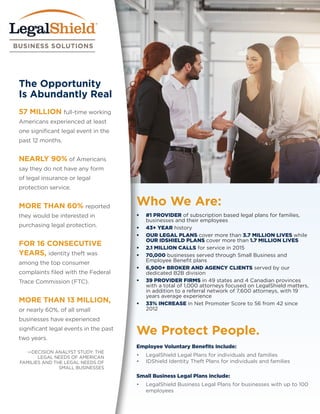 This document promotes the opportunity to sell LegalShield's legal and identity theft protection products as an independent associate. It outlines the benefits of becoming an associate such as industry-leading products, generous commissions, and no sales quotas. LegalShield has over 40 years of experience and covers millions of individuals. Associates can earn commissions in multiple ways including from initial sales and recurring residuals. The opportunity provides a lucrative income stream for those interested in protecting families and small businesses.