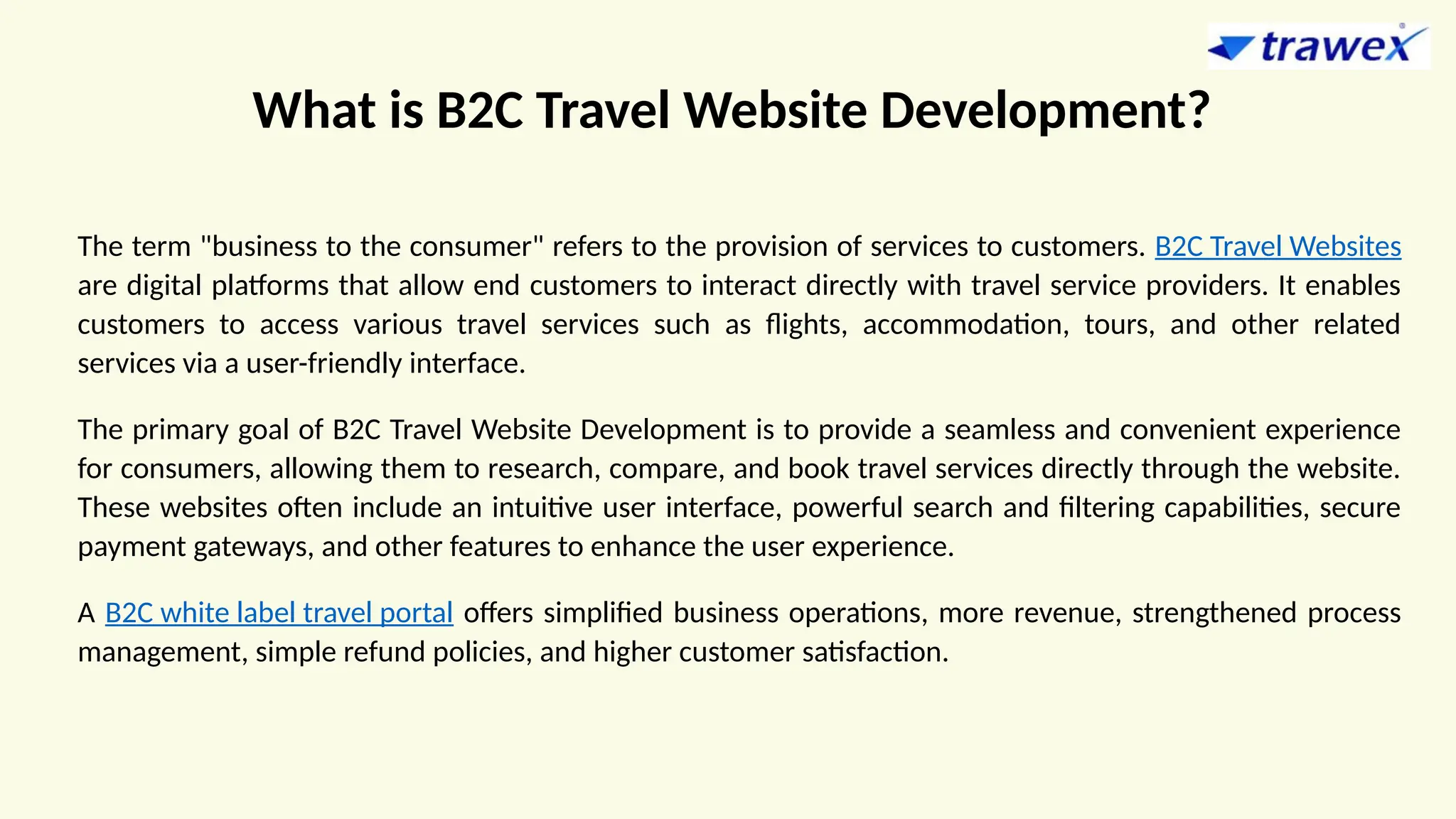 Trawex provides B2C Travel Website Development, B2C Travel Software, B2C Mobile App, B2B Travel Website Development to the global travel industry. Trawex is your one-stop partner for your B2C travel website development and is committed to delivering B2C travel website that suits your business needs. of B2C Travel Website Development provides a seamless and convenient experience for consumers, allowing them to research, compare, and book travel services directly through the website. For more details, Pls visit our website: https://www.trawex.com/b2c-travel-website-development.php