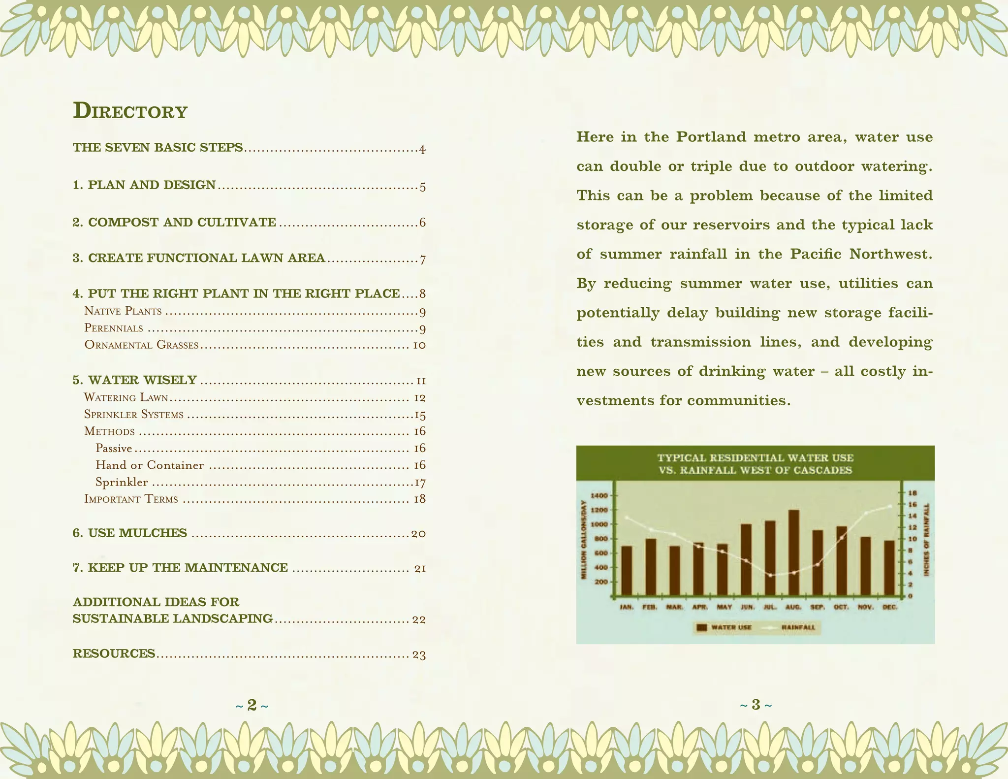Outdoor water use in the Portland area can double or triple in the summer due to watering lawns and gardens. This increased demand strains limited water storage and supply. By reducing summer water use through water-efficient landscaping practices, utilities can delay costly infrastructure expansions. The document outlines seven steps to create a water-efficient landscape: plan and design, compost and cultivate soil, create functional lawn areas, choose appropriate plants, water wisely, use mulches, and maintain the landscape properly. Proper plant selection, efficient watering methods, soil improvements, and mulching can help landscapes thrive while using less water.