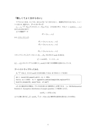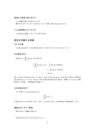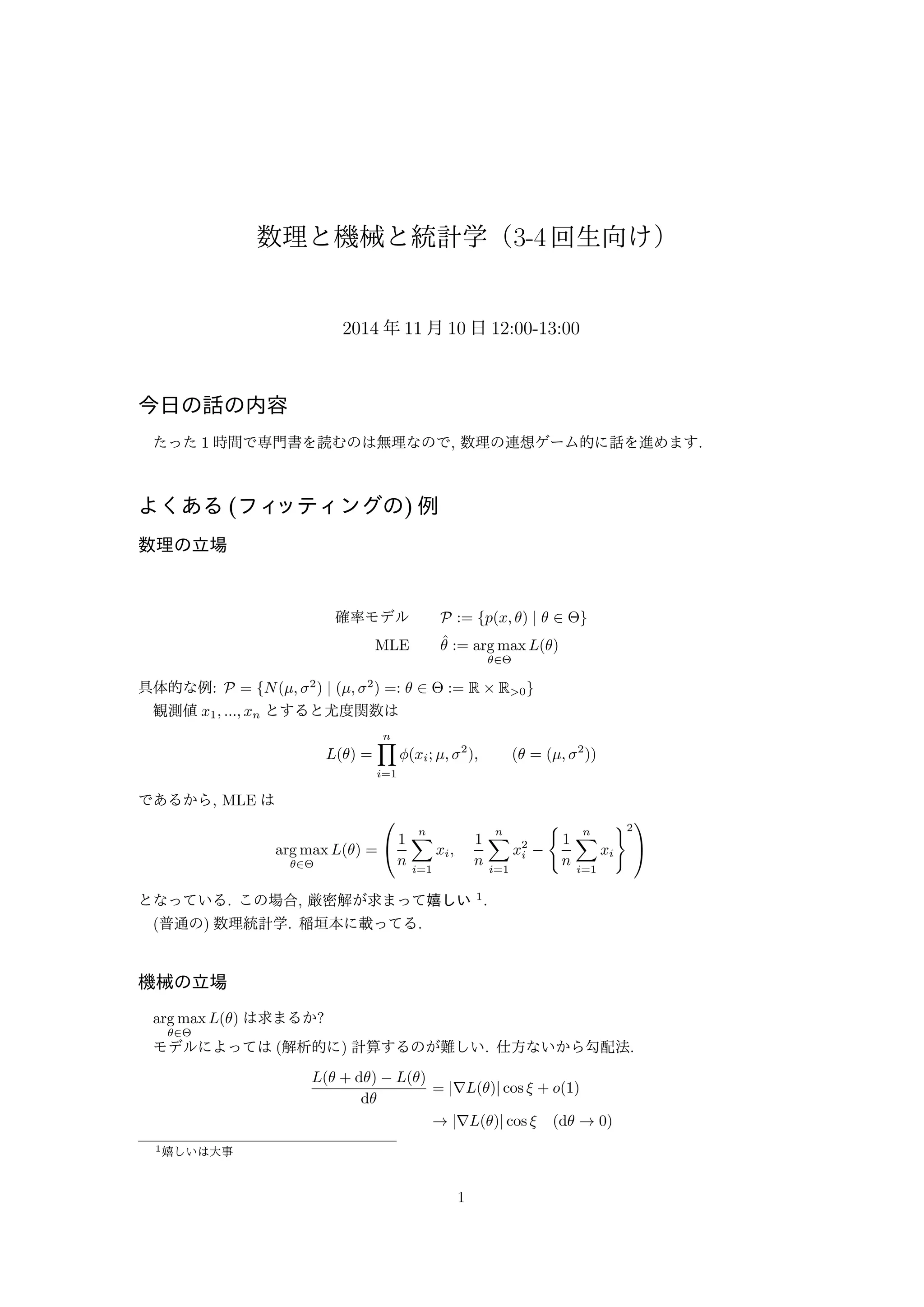 年11 月10 日12:00-13:00 今日の話の内容 たった1 時間で専門書を読むのは無理なので, 数理の連想ゲーム的に話を進めます. よくある(フィッティングの) 例 数理の立場 確率モデルP := fp(x; ) j 2 g MLE ^ := arg max 2 L() 具体的な例: P = fN(; 2) j (; 2) =: 2 := R R0g 観測値x1; :::; xn とすると尤度関数は L() = Πn i=1 ϕ(xi; ; 2); ( = (; 2)) であるから, MLE は arg max 2 L() = 0 @1 n Σn i=1 xi; 1 n Σn i=1 x2i { 1 n Σn i=1 xi }2 1 A となっている. この場合, 厳密解が求まって嬉しい1. (普通の) 数理統計学. 稲垣本に載ってる. 機械の立場 arg max 2 L() は求まるか? モデルによっては(解析的に) 計算するのが難しい. 仕方ないから勾配法. L( + d) L() d = j∇L()j cos + o(1) ! j∇L()j cos (d ! 0) 1嬉しいは大事 1