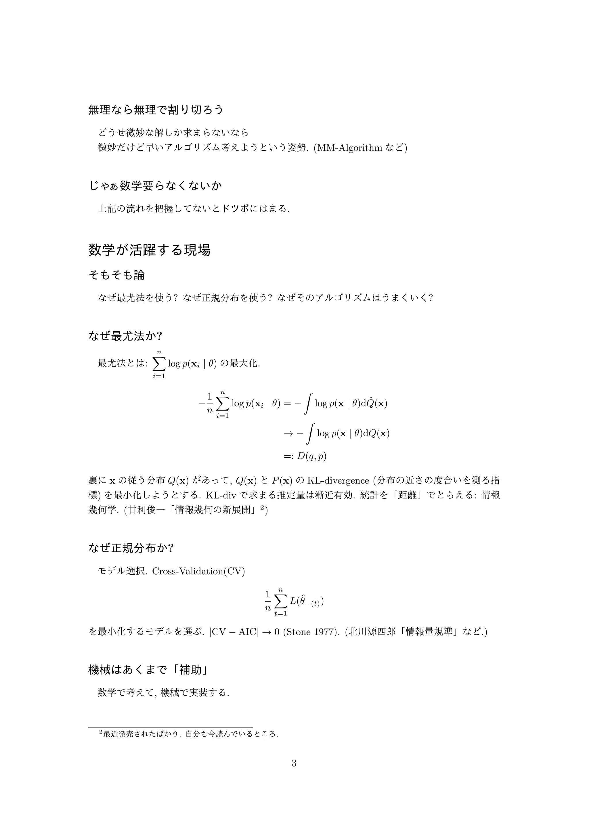 (MM-Algorithm など) じゃぁ数学要らなくないか 上記の流れを把握してないとドツボにはまる. 数学が活躍する現場 そもそも論 なぜ最尤法を使う? なぜ正規分布を使う? なぜそのアルゴリズムはうまくいく? なぜ最尤法か? 最尤法とは: Σn i=1 log p(xi j ) の最大化. 1 n Σn i=1 log p(xi j ) = ∫ log p(x j )d^Q (x) ! ∫ log p(x j )dQ(x) =: D(q; p) 裏にx の従う分布Q(x) があって, Q(x) とP(x) のKL-divergence (分布の近さの度合いを測る指 標) を最小化しようとする. KL-div で求まる推定量は漸近有効. 統計を「距離」でとらえる: 情報 幾何学. (甘利俊一「情報幾何の新展開」2) なぜ正規分布か? モデル選択. Cross-Validation(CV) 1 n Σn t=1 L(^(t)) を最小化するモデルを選ぶ. jCV AICj ! 0 (Stone 1977). (北川源四郎「情報量規準」など.) 機械はあくまで「補助」 数学で考えて, 機械で実装する. 2最近発売されたばかり. 自分も今読んでいるところ. 3