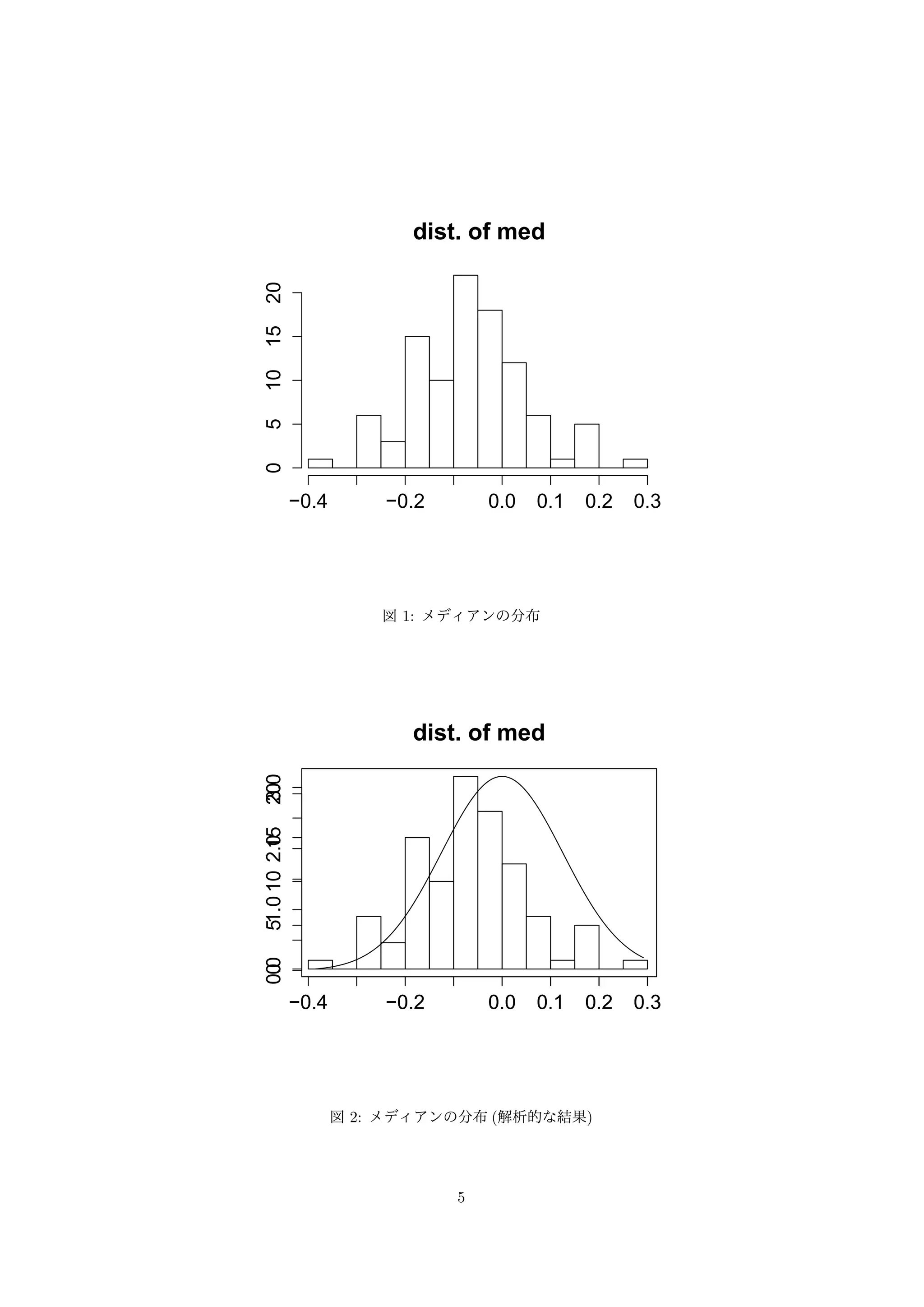 −0.4 −0.2 0.0 0.1 0.2 0.3 0 5 10 15 20 図1: メディアンの分布 dist. of med −0.4 −0.2 0.0 0.1 0.2 0.3 0 5 10 15 20 0.0 1.0 2.0 3.0 図2: メディアンの分布(解析的な結果) 5