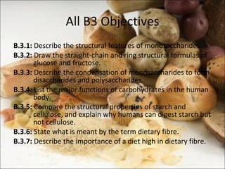 This document outlines objectives related to carbohydrate structure and function. It describes the structural features of monosaccharides like glucose and fructose, how they combine to form disaccharides and polysaccharides, and examples like starch, glycogen and cellulose. It also summarizes the major functions of carbohydrates in the human body like energy storage and providing precursor molecules, and why humans can digest starch but not cellulose due to structural differences. Finally, it defines dietary fiber and its importance for health.