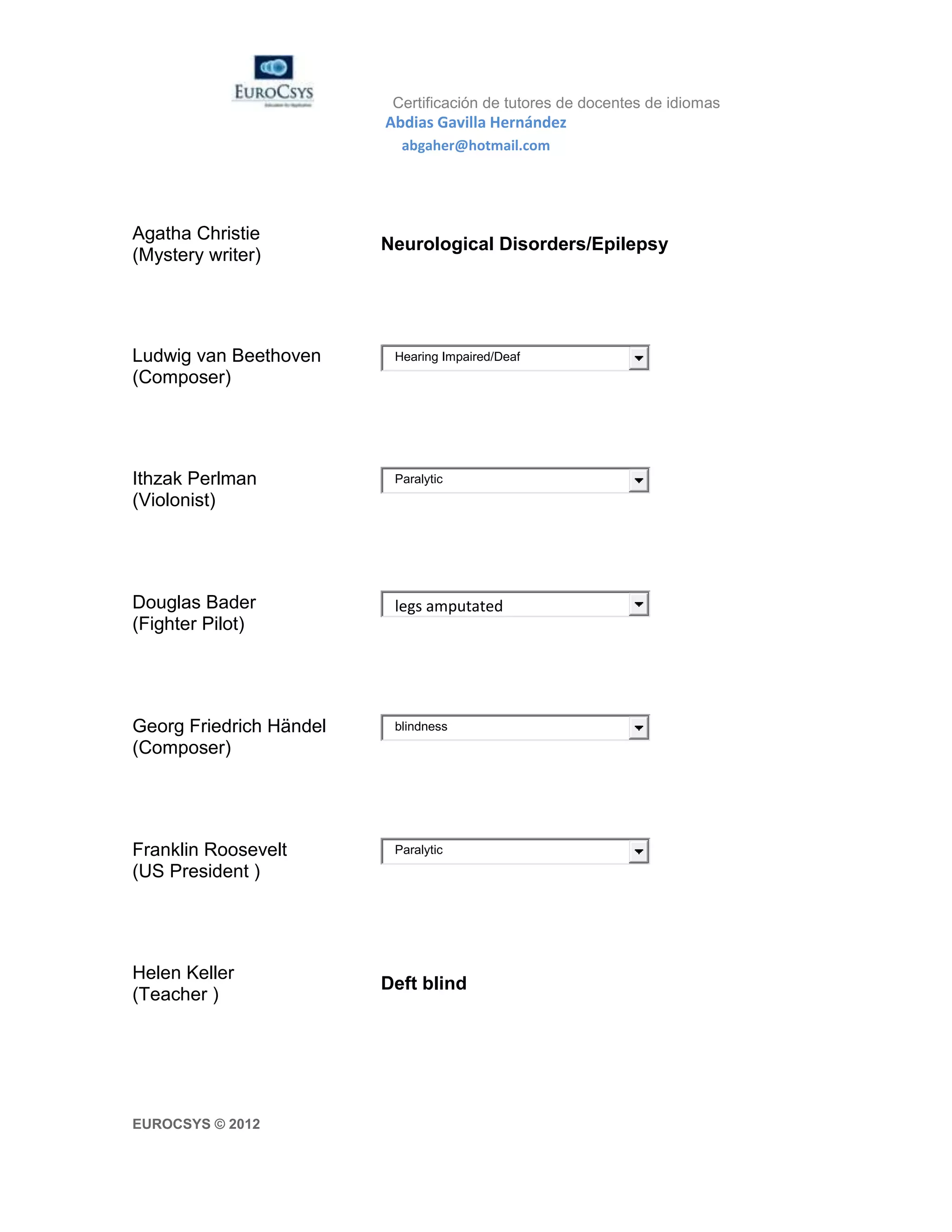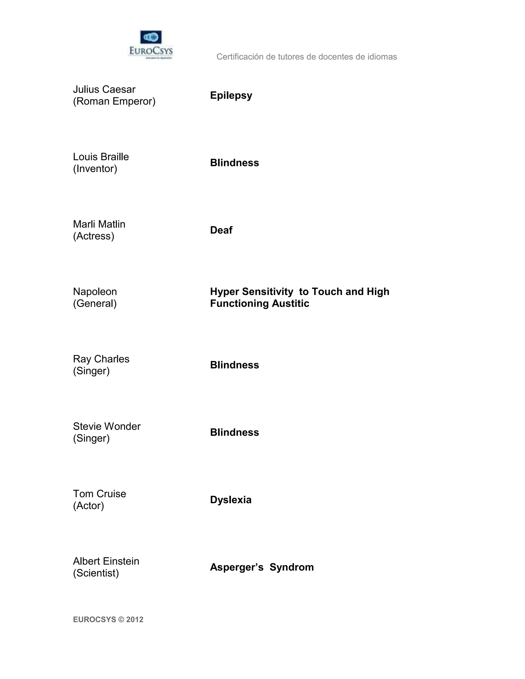 This document lists famous historical figures throughout history who had various disabilities or neurological disorders such as deafness, blindness, dyslexia, epilepsy, paralysis, and Asperger's syndrome. Some of the individuals mentioned include Ludwig van Beethoven, Helen Keller, Napoleon, Ray Charles, Stevie Wonder, Albert Einstein, Leonardo da Vinci, and Walt Disney. The document provides the names of these figures and the disabilities or disorders they had.