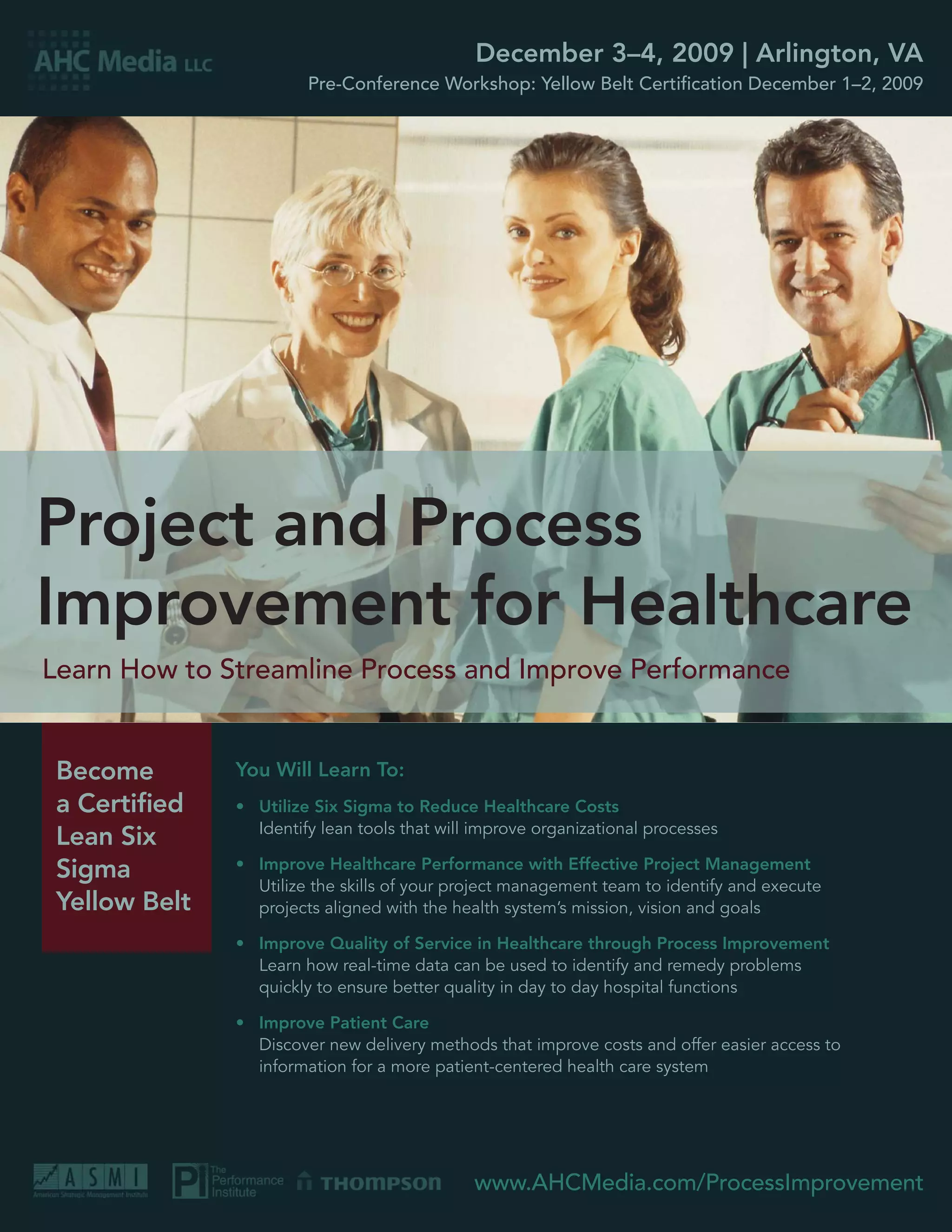 This document provides information about an upcoming conference on project and process improvement for healthcare to be held on December 1-4, 2009 in Arlington, VA. The conference will provide training to obtain Lean Six Sigma Yellow Belt certification and teach attendees how to utilize Six Sigma and lean tools to reduce healthcare costs, improve processes, enhance quality of service, and improve patient care. The agenda outlines keynote speeches and workshops that will cover topics such engaging physicians, transforming healthcare delivery, improving performance through project management, creating a culture of service excellence, and using data to enhance quality.