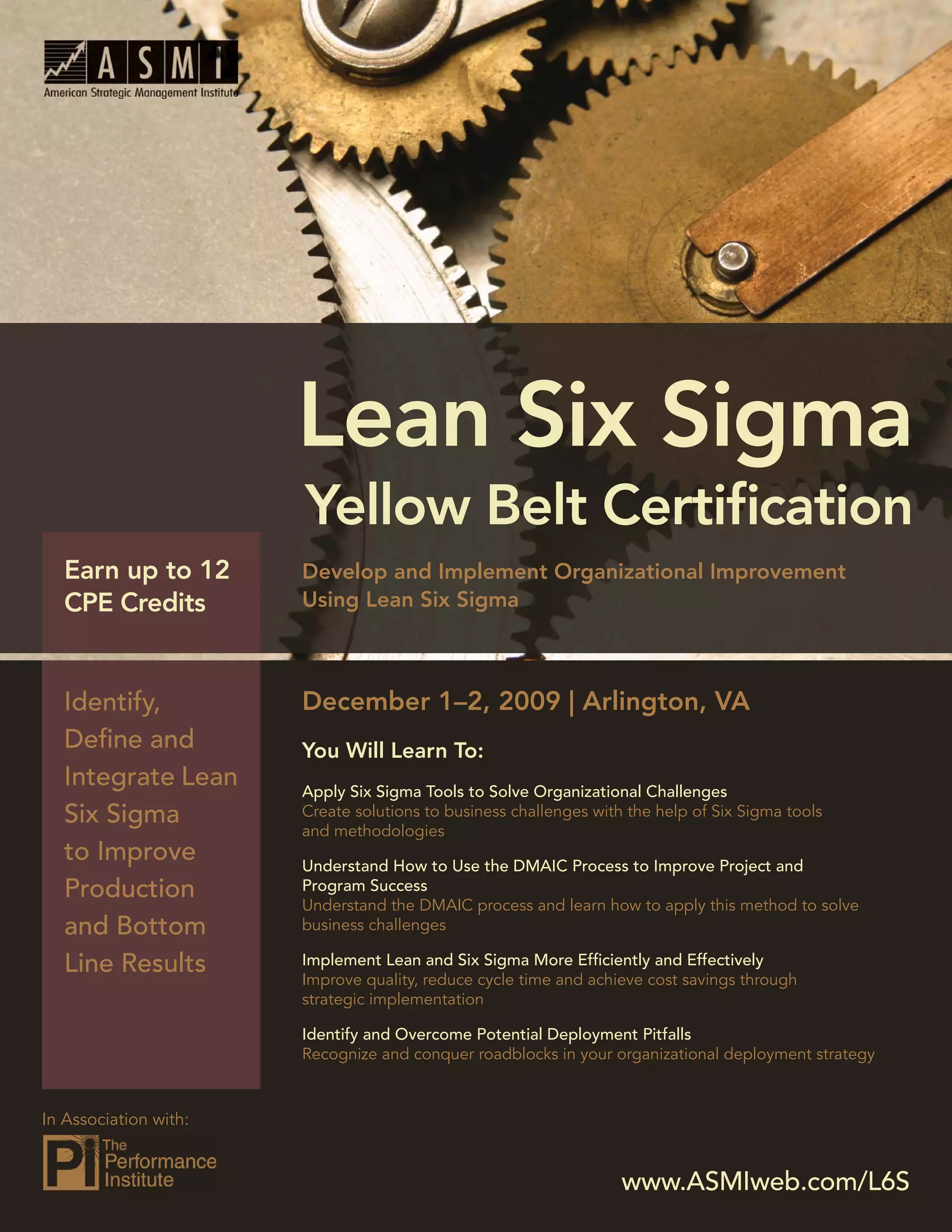 This document provides information about a Lean Six Sigma Yellow Belt Certification training program. The two-day training will teach participants to [1] apply Six Sigma tools to solve organizational challenges, [2] use the DMAIC process to improve projects and programs, and [3] implement Lean and Six Sigma more efficiently. [2] Attendees will learn techniques to continuously improve processes and complete an organizational improvement project.