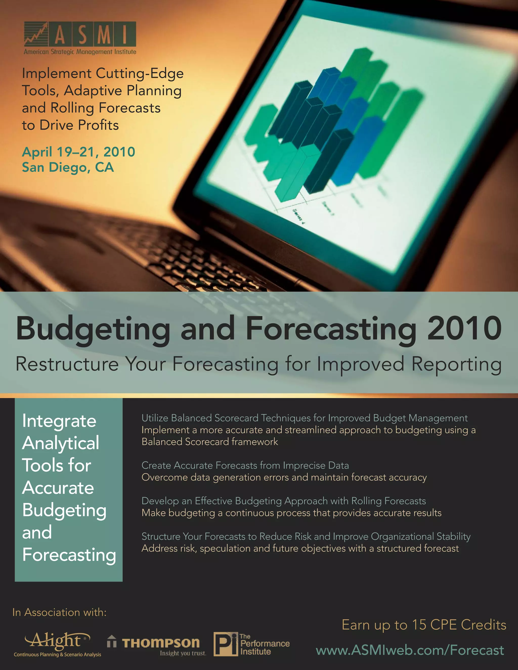 The document provides information about the "Budgeting and Forecasting 2010: Restructure Your Forecasting for Improved Reporting" conference. The conference will take place from April 19-21, 2010 in San Diego, CA and provide attendees with techniques and strategies for improving budgeting and forecasting practices. Speakers will discuss topics like implementing balanced scorecards, developing accurate forecasts with imperfect data, and transitioning to rolling forecasts. Attendees can earn up to 15 CPE credits.