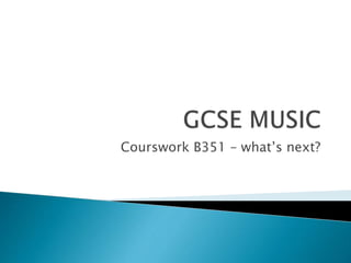 This document outlines the upcoming assignments and tasks for coursework B351. Students will complete a performance assessment, commentary, and composition. They will record performances on Tuesdays and Wednesdays according to a timetable. When not recording, students will plan and prepare "sketches" for their composition by considering elements like structure, techniques, and mood that they will employ and why. They will also draft an opening melodic phrase and accompaniment details.