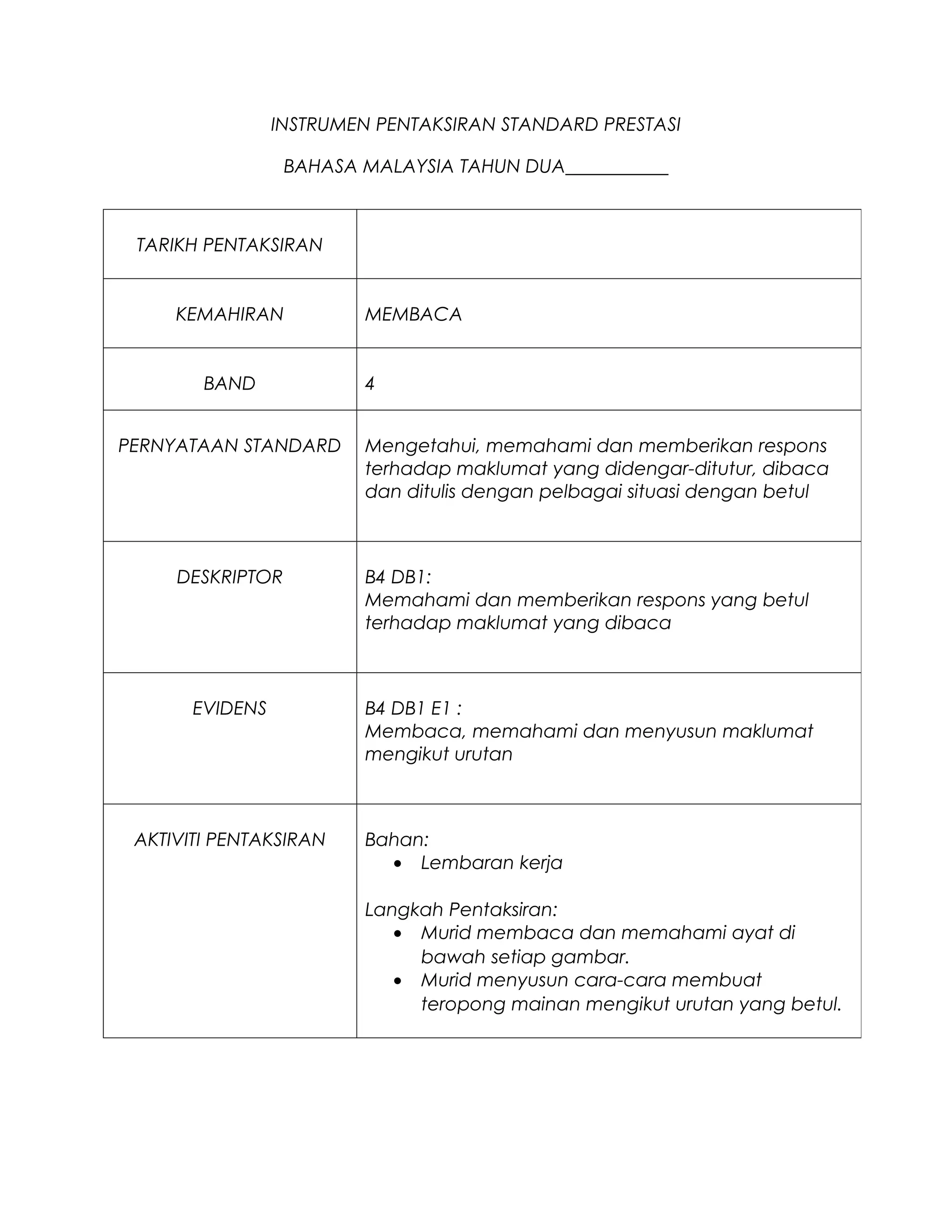 Dokumen ini adalah instrumen pentaksiran untuk kemahiran membaca dalam bahasa Malaysia tahun dua. Ia mengandungi langkah-langkah bagi murid untuk membaca dan menyusun maklumat dengan betul. Aktiviti yang dinyatakan melibatkan penyusunan cara-cara membuat teropong mainan.
