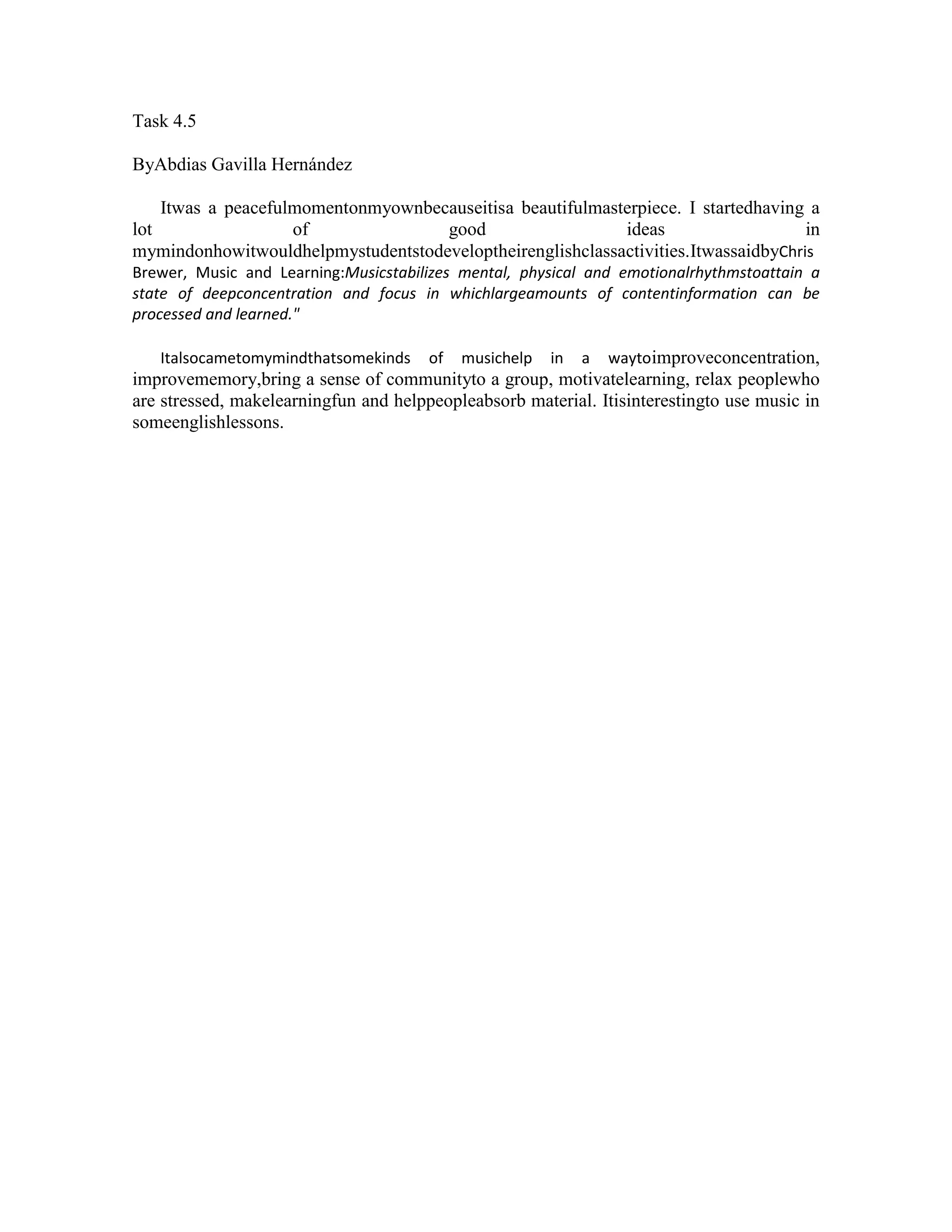 The document discusses using music in English language lessons to help students. It notes that music can help stabilize mental, physical, and emotional rhythms to attain deep concentration and focus. It also reflects on how certain types of music may improve concentration, memory, bring a sense of community, motivate learning, relax stressed students, and make learning more fun by helping students absorb material better. The author had ideas on how incorporating music could help develop their students' English class activities.