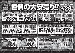 本舗 TEL.288-5355 TEL.222-2325塩干珍味・旬鮮活魚 桜もち140円 (税別) 純生クリーム どら焼 150円 (税別) 古き良き日本 あずき まるごと TEL.285-1005 当店手造り当店は播磨地方の地豆を使用しております!!当店は播磨地方の地豆を使用しております!! 480円 (税別) 鮮魚 ●5切厚切3切 ●1個 ●1個 特選 塩鮭 季節の お造り(単品) 平日1盛580円を 釜揚げ新子 兵庫県産 大特価 大奉仕 塩干 ●平日90g580円を 10g増量!100gで 新物イカナゴ くぎ煮 淡路産 380円 (税別) ●1パック/平日550円を ●100g/平日198円を 480円 (税別) 168円 (税別) 不 動 の 一 番 人 気 !! 不 動 の 一 番 人 気 !! 愛知産大あさり ●特大1尾/2,480円を 1,980円 (税別) 愛知産 自家製 うなぎ蒲焼き 生イカナゴ予約承ります!お気軽にどうぞ!!生イカナゴ予約承ります!お気軽にどうぞ!! 一家団欒のお供に松屋の御菓子はいかがですか? 毎月29日は メール会員募集中!! イオン姫路店専門店街のお得な情報をお届け!! ★右記QRコードを携帯で読み込んで、空メールを送るだけ! 各専門店の情報が盛りだくさん!! http://www.aeon-himeji.com/ ホ ー ム ペ ー ジ も チ ェ ッ ク し て ね !! ホームページでお得情報 更新中!お見逃しなく!! ホ ー ム ペ ー ジ も チ ェ ッ ク し て ね !! ホームページでお得情報 更新中!お見逃しなく!! ポイントを貯めると 素敵な特典が付いて くるとってもお得なカード! 「舞カード」「舞カード」「舞カード」 会員随時 募集中!! 会員随時 募集中!! 168円 (税込) 牛ハラミ パート 募集!! 850円詳しくは下記まで お問い合わせください。 ●100g/味付 ●1個/130円を 88円 (税込) 198円 (税込) 牛鉄板 焼肉用 ●100g/味付 牛もつ鍋 88円 (税込) 牛塩カルピ●100g●100g/味付 平 日 950円 日 祝 木綿豆腐・絹ごし豆腐 ●各1丁 120円を 2丁で 150円 (税込) 200円 (税込) 厚あげ(木綿)・絹あげ バーベキューに!鉄板焼に!! ●各1袋/200円を 当店 手造り 当店 手造り お得です!! 108円 (税込) 108円 (税込) ●2人前 300円 (税込) 300円 (税込) 冷凍肉まんわらび餅 ニクノヒ 今年も 始めました!! 今が旬!! 売り出し日 イオン姫路店 食料品専門店街 イオン姫路店 食料品専門店街 イオン姫路店 食料品専門店街 イオン姫路店 食料品専門店街 恒例の大安売り恒例の大安売り食料品 専門店街 恒例の大安売り!!!!!! http://www.aeon-himeji.com/ http://www.aeon-himeji.com/ http://www.aeon-himeji.com/ http://www.aeon-himeji.com/ /283/283/283/283 土
