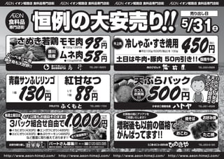 食料品専門店街 イオン姫路店 食料品専門店街 イオン姫路店 食料品専門店街 食べておいしい 讃岐若鶏専門店 TEL.281-5223 ●100g138円を モモ肉98円 (税別) ●100g88円を ムネ肉58円 (税別) バーベキュー用 バーベキュー用 バーベキュー用焼き鳥も大好評!! 焼き鳥も大好評!! 焼き鳥も大好評!! さぬき若鶏さぬき若鶏 香川 県産 ●イカにぎり(430円)●エンガワにぎり(485円) ●エビにぎり(430円)●あぶりサーモン(485円) 3パック組合せ自由で など豊富に取り揃えております!! 全て数量限定!! 毎週土曜日は お持ち帰り寿し 肉のびぜんや TEL.222-2929 450円 (税込) 冷しゃぶ・すき焼用 土日は牛肉・豚肉 50円引き!! FRUITS ふくもと TEL.285-1723 紅甘なつ青森サンふじリンゴ 1個 130円 (税込) ●平日100g/500円(税込)を 100g 牛上肉 国産牛豚 1個 88円 (税込) 天ぷらパック天ぷらパック TEL.281-4528かまぼこ姫路名産 天ぷらパック 5コ入 お買得 !!! 500円500円 (税込) ハ ト ヤ で 人 気 の 天 ぷ ら を 詰 合 せ ま し た !! ハ ト ヤ で 人 気 の 天 ぷ ら を 詰 合 せ ま し た !! ハ ト ヤ で 人 気 の 天 ぷ ら を 詰 合 せ ま し た !! 4/1以降もお値段そのまま!!4/1以降もお値段そのまま!! たこ焼 お好み焼 おこわ 焼そば たこ焼・おこわ・お好み焼 TEL.283-6180TEL.283-6180TEL.283-6180 お買物の間にアツアツを ご用意いたします!! 0120-920-395パートさん募集!! ●販売員・調理補助/時給805円より、平日8:50∼15:00、週3・4日勤務できる方 詳しくは 1,00000円 (税込)(税込) 1,000円 (税込) L寸 増税後も以前の価格で増税後も以前の価格で がんばってます!!がんばってます!! 増税後も以前の価格で がんばってます!! 恒例の大安売り恒例の大安売り恒例の大安売り恒例の大安売り食料品 専門店街 恒例の大安売り!!!!!!/315/315/315/315/315/315 土