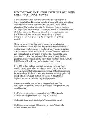 This document provides a comprehensive guide on starting a home-based import/export business, emphasizing the low entry barriers and high earning potential. It outlines essential steps for getting started, including selecting products, determining target customers, and establishing a business framework. Additionally, it highlights the importance of market knowledge, communication skills, and effective marketing strategies for success in the import/export industry.