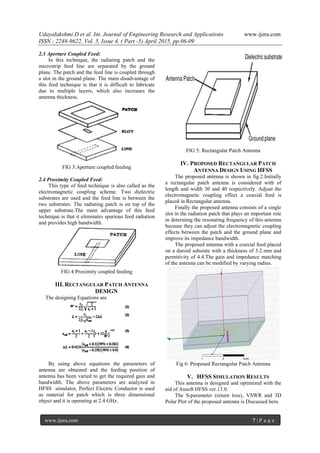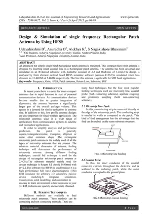 This document describes the design and simulation of a single frequency rectangular patch antenna using HFSS simulation software. A rectangular patch antenna was designed on an RTduroid substrate with a dielectric constant of 2.2 and thickness of 3.2mm. A coaxial feed was inserted into the rectangular patch to simplify the design. The antenna was simulated using HFSS and a return loss of -31.4402dB was obtained at 2.4GHz, indicating it is applicable for SHF band applications. Key antenna parameters like return loss, VSWR, and 3D radiation pattern were evaluated through HFSS simulation to analyze the antenna performance.