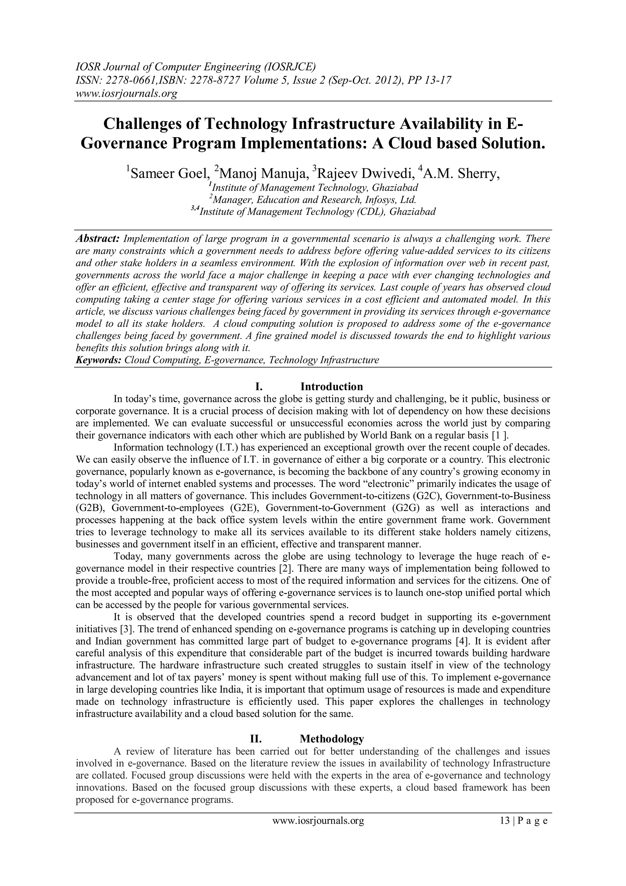 This document discusses the challenges of technology infrastructure availability for e-governance program implementations. It proposes a cloud-based solution to address some of these challenges. The key challenges identified are the complexity of setting up and managing infrastructure across different locations, ongoing system management needs due to rapid technology changes, and high costs of recruiting and retaining IT professionals. The proposed solution involves implementing a hybrid cloud model with both public and private clouds. This would provide 24/7 access to services, reduce costs by outsourcing infrastructure needs, simplify administration, enable mobile access, and ensure scalability and high performance. The cloud-based framework is presented as an effective way to overcome infrastructure challenges and efficiently deliver e-governance programs.