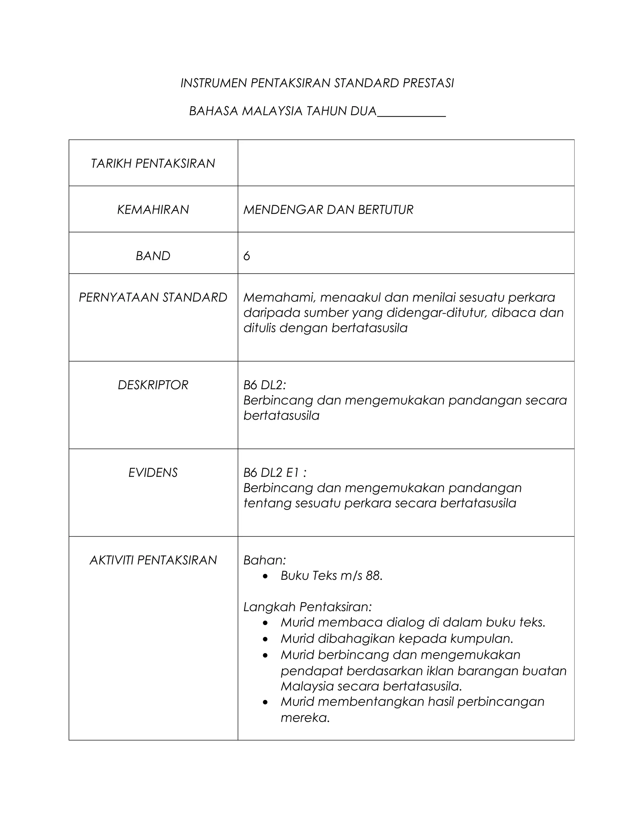 Dokumen ini membahas instrumen pentaksiran untuk kemahiran mendengar dan bertutur dalam bahasa Malaysia untuk tahun dua. Aktiviti melibatkan murid membaca dialog, berbincang dalam kumpulan, dan membentangkan pendapat tentang iklan barangan buatan Malaysia secara bertatasusila. Penilaian ini bertujuan untuk memahami dan menilai perkara daripada sumber yang didengar dan dibaca.