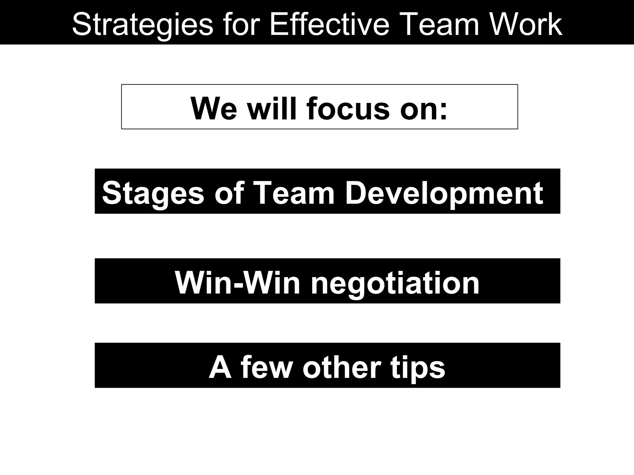 The document discusses strategies for effective team work, focusing on stages of team development and win-win negotiation. It describes the four stages of team development as forming, storming, norming, and performing. It also emphasizes the importance of working towards win-win solutions and maintaining positive relationships within the team.