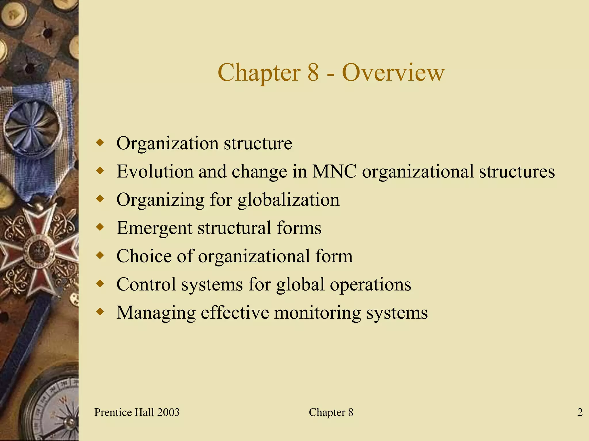 This chapter discusses organization structures for multinational corporations, including domestic structures expanded for international operations, international divisions, global functional structures, and global geographic structures. It also covers control systems for global operations and managing effective monitoring across different countries and cultures. Emergent forms like networks and alliances are discussed. Factors in choosing structures include opportunities for globalization and localization.