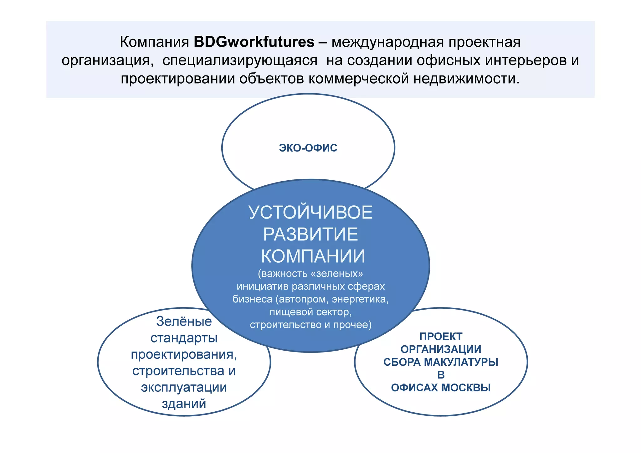 Документ описывает инициативы компании bdgworkfutures в области защиты окружающей среды через проектирование эко-офисов и использование устойчивых практик. Среди ключевых направлений работы: экономия ресурсов, раздельный сбор отходов и применение экологически чистых стандартов в строительстве. Также упоминается статистика переработки макулатуры и важность сохранения природных ресурсов.