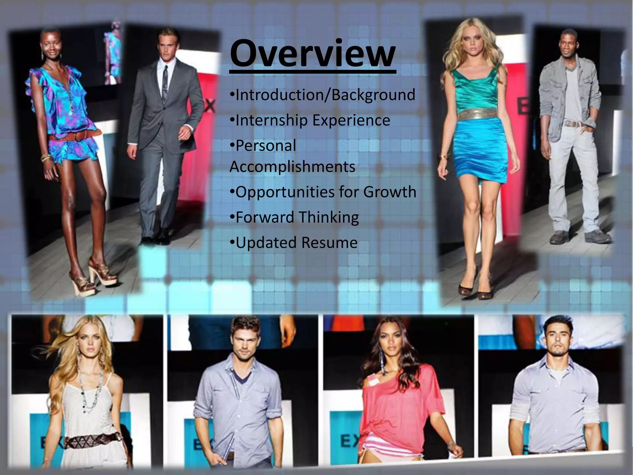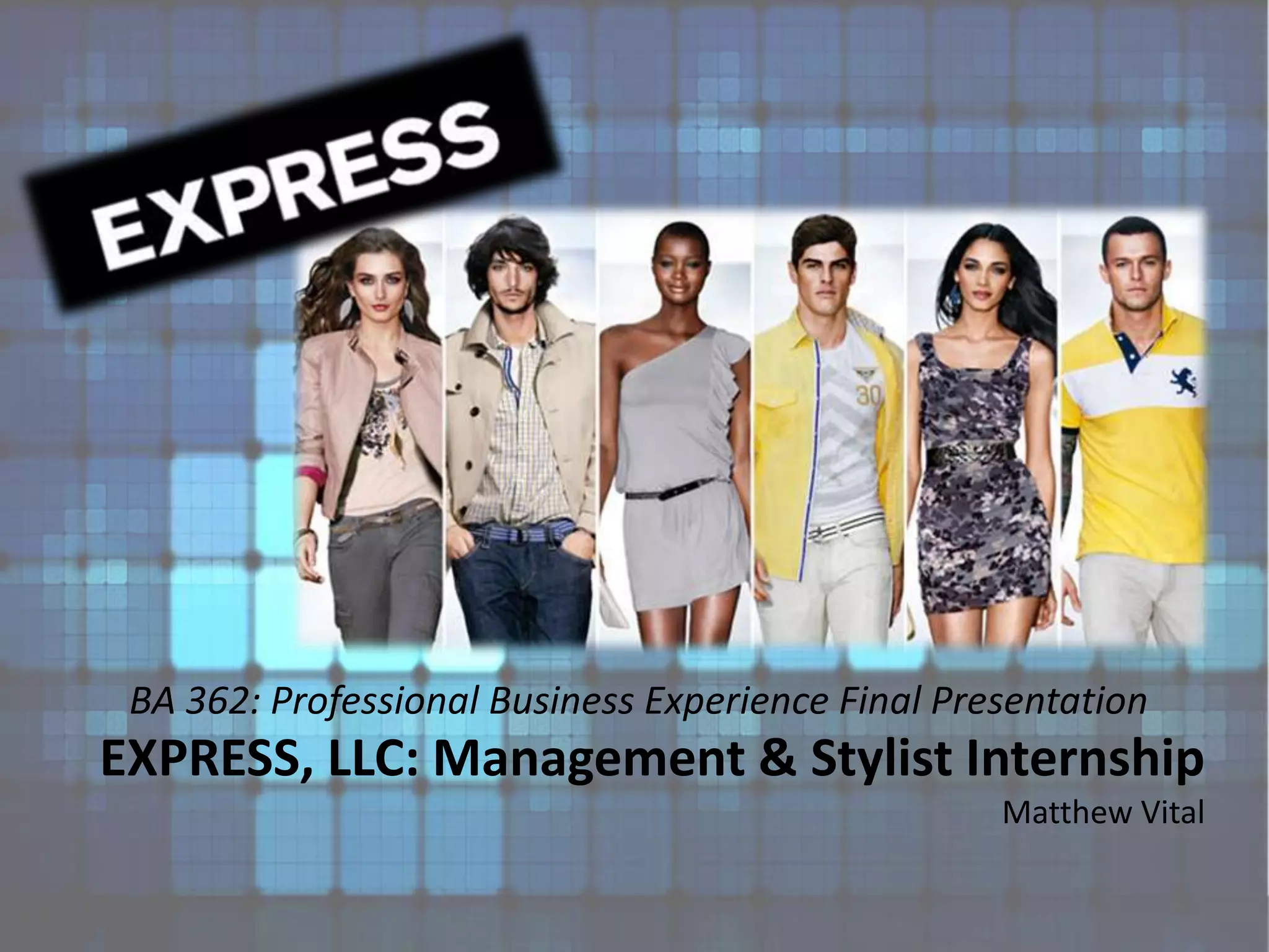 Matthew Vital completed a management and stylist internship at EXPRESS, LLC, a specialty retailer of men's and women's apparel. During his internship, he gained experience maintaining floorset looks, processing shipments, assisting with training and orientations, and providing outfit styling suggestions to customers. He accomplished personal goals related to leadership skills and developed qualities like being hardworking, dedicated, and having a positive attitude. Going forward, he is considering summer internships and job opportunities at EXPRESS and other retailers under URBN Inc., as well as continuing his education in fashion design, marketing or management.