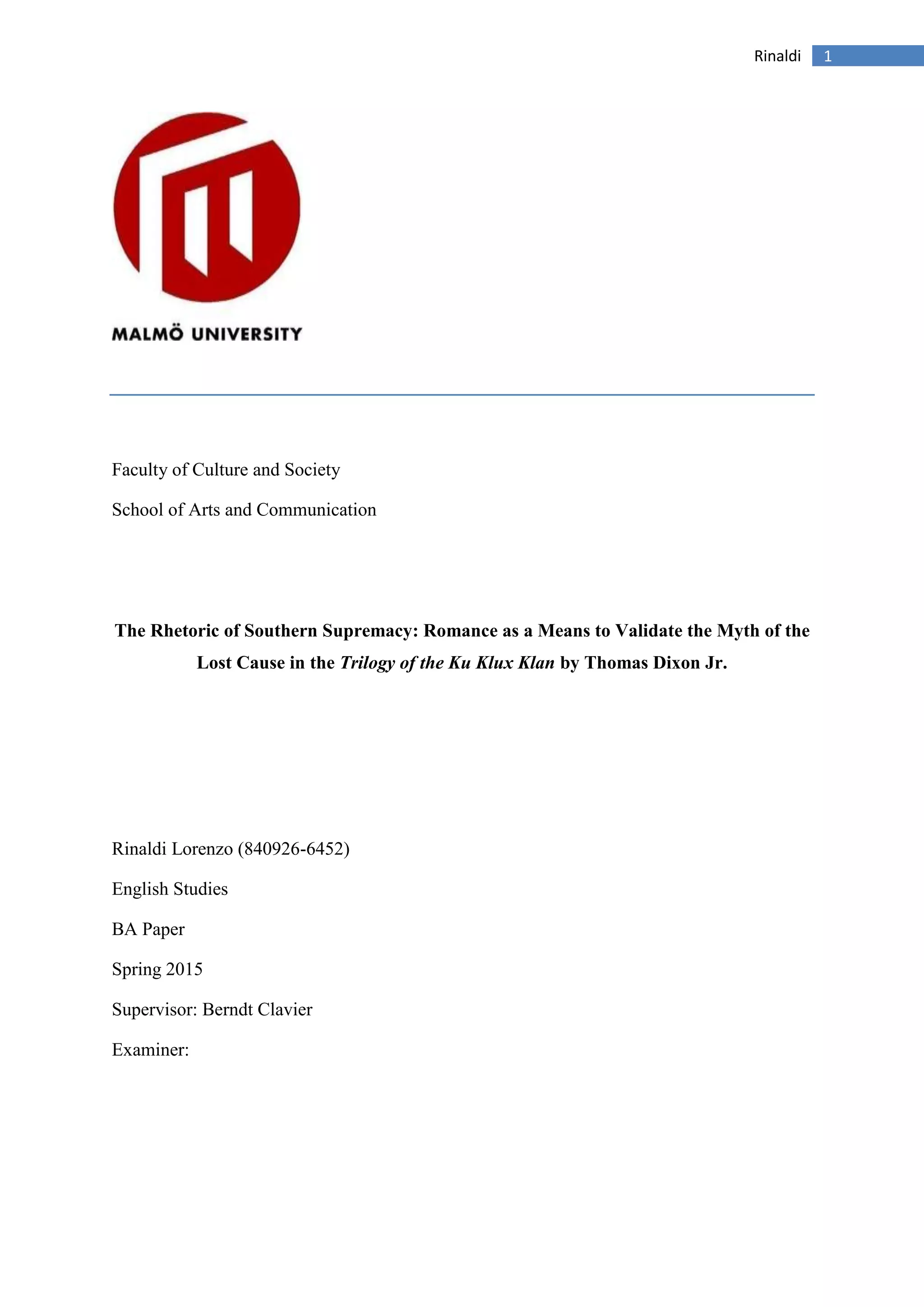 This document provides context for analyzing Thomas Dixon Jr.'s trilogy The Ku Klux Klan through the lens of romance and the Lost Cause myth. It discusses the Reconstruction era setting of Dixon's novels, the origins and religious aspects of the Lost Cause myth, and how romance as a genre is well-suited to convey mythical ideals through its use of imagination and dichotomies of good and evil. The analysis will focus on how Dixon used elements of the Lost Cause like religion, the Civil War narrative, relationships to land, and violence, combined with the rhetorical devices of romance, to validate white southern supremacy in his works.