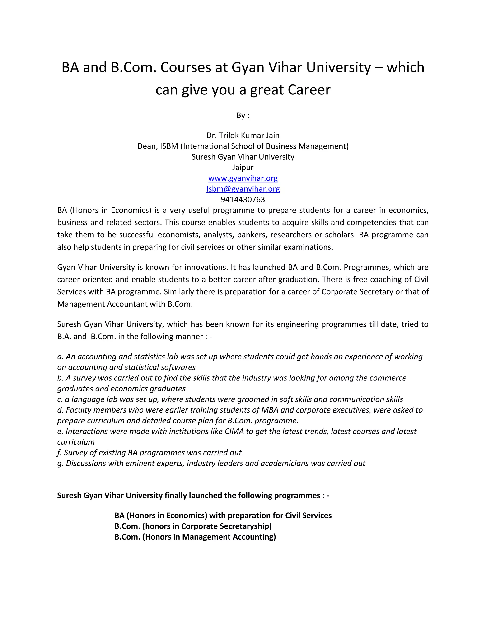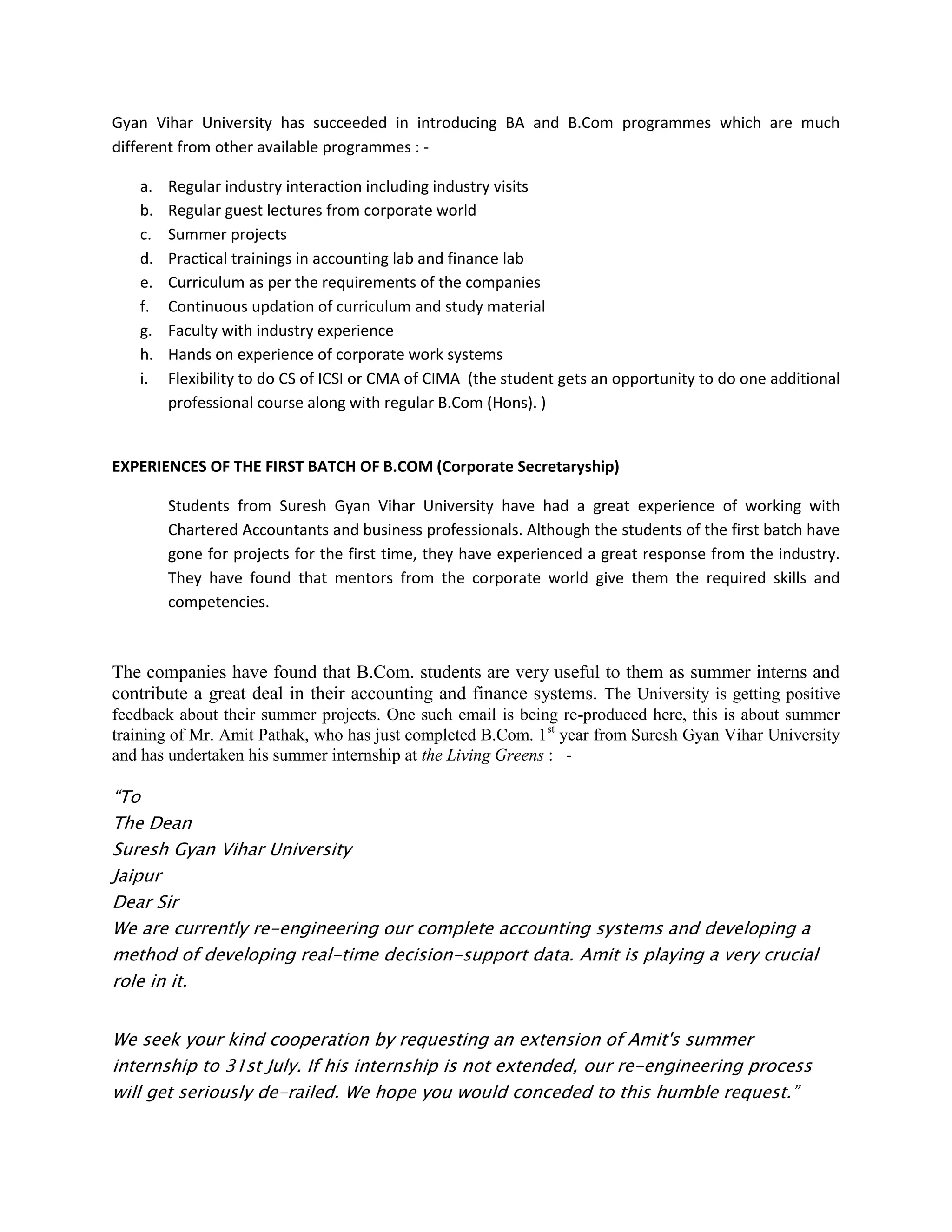 BA and B.Com. programs at Gyan Vihar University aim to provide career-oriented education. The BA (Honors in Economics) program prepares students for careers in economics, business, banking, research, and civil services. Gyan Vihar University launched innovative BA and B.Com. programs that enable students to have better careers after graduation. The programs include industry interactions, guest lectures, practical training, and faculty with industry experience to provide skills sought by employers. Students from the first batch of the B.Com. (Corporate Secretaryship) program had positive experiences working with chartered accountants and receiving valuable skills from corporate mentors during their summer internships.