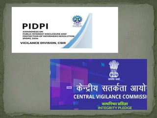 This presentation summarizes India's Public Interest Disclosure and Protection of Informers (PIDPI) resolution. It introduces PIDPI, noting that it authorizes the Central Vigilance Commission (CVC) to receive complaints about corruption from whistleblowers. It describes the CVC's role in advising government agencies on anti-corruption efforts and reviews complaints confidentially. The presentation emphasizes that PIDPI protects whistleblower identities and allows complaints against central government officials to be investigated.