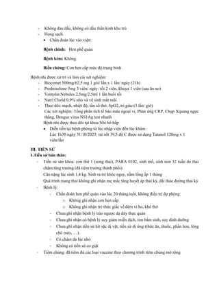 Bệnh nhân nữ 26 tháng tuổi vào viện vì khó thở, ho và sốt, được chẩn đoán hen phế quản kèm cơn hen cấp trung bình. Lịch sử bệnh cho thấy trẻ có tiền sử hen phế quản từ 20 tháng tuổi và không có điều trị dự phòng, cùng với nhiều yếu tố dị ứng. Trẻ đã được điều trị bằng thuốc giãn phế quản và phun khí dung, hiện tại có dấu hiệu hồi phục tốt.