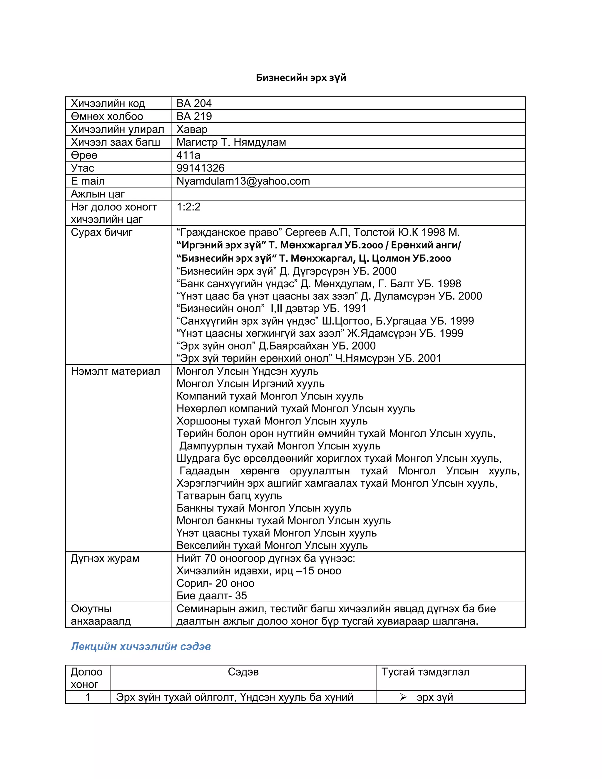 Бизнесийн эрх зүй<br/> <br />Хичээлийн кодВА 204Өмнөх холбооBA 219Хичээлийн улиралХаварХичээл заах багшМагистр Т. НямдуламӨрөө411аУтас99141326E maiлNyamdulam13@yahoo.comАжлын цагНэг долоо хоногт хичээлийн цаг1:2:2Сурах бичиг“Гражданское право” Сергеев А.П, Толстой Ю.К 1998 М. “Иргэний эрх зүй” Т. Мөнхжаргал УБ.2000 / Ерөнхий анги/ “Бизнесийн эрх зүй” Т. Мөнхжаргал, Ц. Цолмон УБ.2000“Бизнесийн эрх зүй” Д. Дүгэрсүрэн УБ. 2000“Банк санхүүгийн үндэс” Д. Мөнхдулам, Г. Балт УБ. 1998“Үнэт цаас ба үнэт цаасны зах зээл” Д. Дуламсүрэн УБ. 2000 “Бизнесийн онол” I,II дэвтэр УБ. 1991“Санхүүгийн эрх зүйн үндэс” Ш.Цогтоо, Б.Ургацаа УБ. 1999“Үнэт цаасны хөгжингүй зах зээл” Ж.Ядамсүрэн УБ. 1999“Эрх зүйн онол” Д.Баярсайхан УБ. 2000“Эрх зүй төрийн ерөнхий онол” Ч.Нямсүрэн УБ. 2001Нэмэлт материалМонгол Улсын Үндсэн хуульМонгол Улсын Иргэний хуульКомпаний тухай Монгол Улсын хуульНөхөрлөл компаний тухай Монгол Улсын хуульХоршооны тухай Монгол Улсын хуульТөрийн болон орон нутгийн өмчийн тухай Монгол Улсын хууль, Дампуурлын тухай Монгол Улсын хуульШудрага бус өрсөлдөөнийг хориглох тухай Монгол Улсын хууль, Гадаадын хөрөнгө оруулалтын тухай Монгол Улсын хууль, Хэрэглэгчийн эрх ашгийг хамгаалах тухай Монгол Улсын хууль,Татварын багц хуульБанкны тухай Монгол Улсын хуульМонгол банкны тухай Монгол Улсын хуульҮнэт цаасны тухай Монгол Улсын хуульВекселийн тухай Монгол Улсын хуульДүгнэх журамНийт 70 оноогоор дүгнэх ба үүнээс: Хичээлийн идэвхи, ирц –15 онооСорил- 20 онооБие даалт- 35Оюутны анхаараалдСеминарын ажил, тестийг багш хичээлийн явцад дүгнэх ба бие даалтын ажлыг долоо хоног бүр тусгай хувиараар шалгана.<br />Лекцийн хичээлийн сэдэв<br />Долоо хоногСэдэвТусгай тэмдэглэл1Эрх зүйн тухай ойлголт, Үндсэн хууль ба хүний эрхэрх зүйзохицуулах зүйлзохицуулалтын аргасубъектхүний эрхүндсэн үүрэгжурамт үүрэг2Бизнесийн эрх зүйн тухай ойлголт, бизнес ба ёс зүйэрх зүйн тогтолцообизнесбизнесийн эрх зүйбизнесийн эрх зүйн хэм хэмжээ3Бизнесийн эрх зүйн харилцаа, түүний элемент, иргэний эрхийн чадвар чадамжбизнесийн эрх зүйн эх сурвалжбизнесийн эрх зүйн харилцаасубъектобъектхарилцааны агуулгаэрх зүйн чадвар, чадамж4Хуулийн этгээдийн ойлголт, ангилалхуулийн этгээдбизнесийн байгууллагахуулийн этгээдийн үндсэн шинжхуулийн этгээдийн байгууллага5Аж ахуйн харилцаан дахь гэрээ хэлцэлхэлцэл (гэрээ)офертакцептсаналын дуудлагагэрээний эрх чөлөө6Нөхөрлөл, хоршоо түүний эрх зүйн зохицуулалтнөхөрлөл ББН, ЗБНнөхөрлөлийг үүсгэн байгуулах гэрээхоршоо, хоршооны удирдлагахоршооны дүрэмхуулийн этгээдийг үүсгэн байгуулах баримт бичигхуулийн этгээдийн улсын бүртгэл7Компанийн эрх зүйн зохицуулалтхувьцаат компанихязгаарлагдмал хариуцлагатай компани үүсгэн байгуулах хуралхувьцаа эзэмшигчкомпанийн дүрэмкомпанийн удирдлагахуулийн этгээдийг үүсгэн байгуулах баримт бичигхуулийн этгээдийн улсын бүртгэл8Гадаадын хөрөнгө оруулалттай аж ахуйн нэгжийн эрх зүйн зохицуулалтгадаадын хөрөнгө оруулалтгадаадын хөрөнгө оруулалттай аж ахуйн нэгжтогтвортой байдлын гэрээхуулийн этгээдийг үүсгэн байгуулах баримт бичигхуулийн этгээдийн улсын бүртгэл9Өмчийн эрх зүйн зохицуулалтөмчийн төрөл, хэлбэрөмчийн эрх зүйн агуулгаөмчлөх эрх үүсэх, дуусгавар болгоххуулийн этгээдийн өмчийн эрх10Үүргийн эрх зүйн зохицуулалтүүрэг үүсэх үндэслэлүүрэг гүйцэтгэх зарчимүүрэг гүйцэтгэх газар, хугацааүүргийн чанарүүргийн 