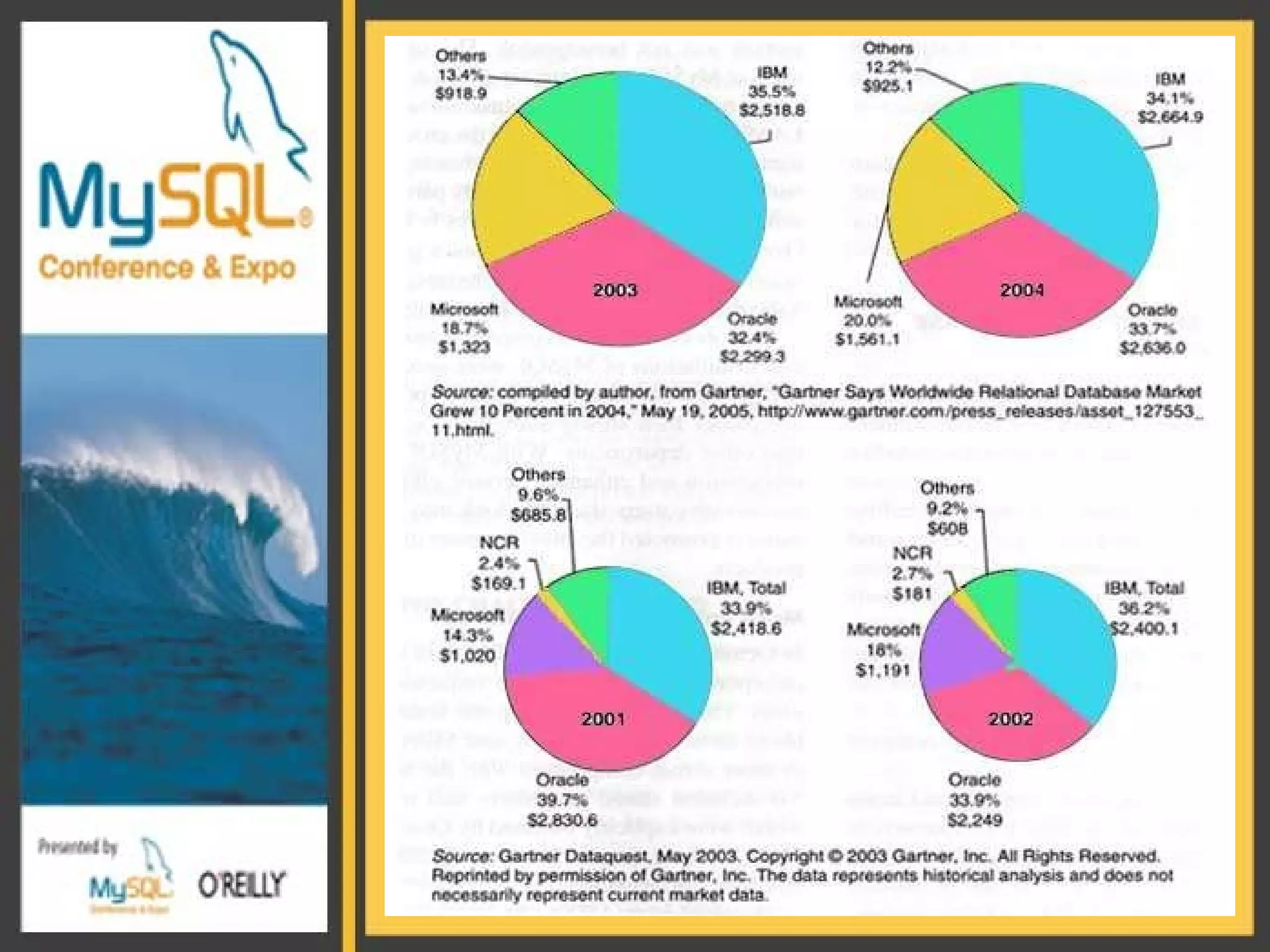 MySQL is an open-source database management system that uses SQL and was a popular choice for new web applications in the 2000s. By 2006, MySQL had over 8 million installations but received less than 1% of revenue from the $15 billion database market, which was dominated by Oracle, IBM and Microsoft. MySQL shifted to offering more paid support and services to generate more revenue beyond one-time licensing fees.