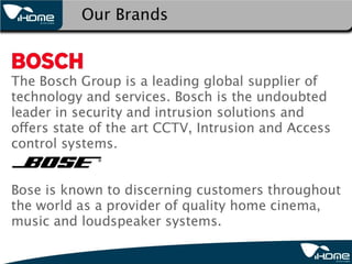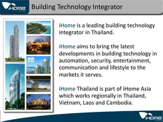 This project proposal outlines a home automation system for the Baan K.Prae project that includes lighting, door phone, curtain, and temperature controls. The system would use command switches, scenario switches, touch screens, iPod/computer controls, and video touch screens to control different zones and groups of lights, blinds, and motors throughout the home. The proposal also discusses product and service support options.