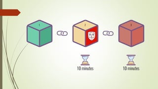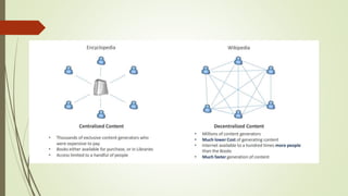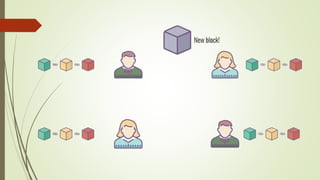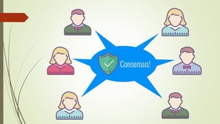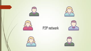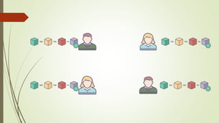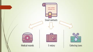 The document discusses using blockchain technology for IoT applications. It first defines IoT and describes problems with centralized IoT communication, such as lack of trust and higher costs. Decentralized communication methods are proposed as an alternative. The document then provides an overview of blockchain technology, describing its key characteristics like distributed ledgers and consensus mechanisms. Finally, the document discusses how blockchain can address issues like security, reliability and autonomy for IoT applications and provides examples of existing blockchain-IoT projects.