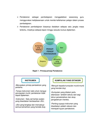 Dokumen ini membincangkan pengertian dan konsep pentaksiran, pengujian, dan penilaian dalam konteks pendidikan, merangkumi proses pengumpulan dan analisis maklumat mengenai pencapaian pelajar. Pentaksiran bertujuan untuk memahami kekuatan dan kelemahan pelajar serta memantau kemajuan mereka, sementara pengujian dan penilaian berfungsi untuk menentukan pencapaian dan memperbaiki proses pembelajaran. Kesemua konsep ini adalah penting untuk membolehkan guru membuat keputusan yang tepat terhadap pengajaran dan pembelajaran.