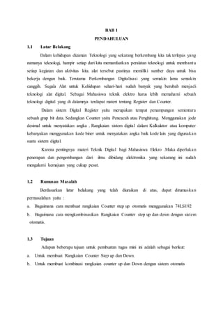 Teks tersebut membahas tentang register, counter, dan IC yang terkait. Secara khusus, teks tersebut menjelaskan pengertian register dan counter dalam sistem digital serta cara kerja IC 74LS47 dan IC 74LS192 untuk membuat rangkaian counter.