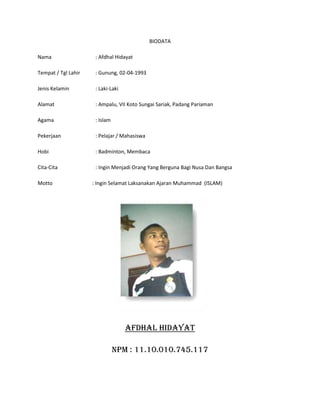 Dokumen ini berisi biodata Afdhal Hidayat dan pembahasan mengenai hakekat manusia serta pendidikan. Hakekat manusia mencakup pemahaman menurut pandangan Islam dan ilmuwan Barat, sedangkan pendidikan menjadi proses penting untuk perkembangan kualitas individu dalam masyarakat. Tujuan pendidikan adalah membentuk manusia yang seutuhnya, tidak hanya fisik tetapi juga spiritual dan sosial.