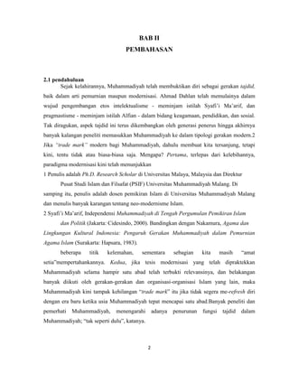 Dokumen ini membahas perkembangan pemikiran Muhammadiyah sebagai gerakan tajdid dalam konteks tantangan sosial dan metodologi keagamaan di abad ke-21. Melalui pembahasan mengenai majelis tarjih, dokumen ini menguraikan perlunya respons terhadap perubahan zaman serta kritik terhadap ketidakmampuan organisasi untuk beradaptasi dengan isu-isu baru seperti globalisasi, pluralisme, dan demokratisasi. Penulis menyarankan pentingnya penyempurnaan pendekatan dan metode dalam pengembangan pemikiran Islam di Muhammadiyah untuk menjawab tantangan tersebut.