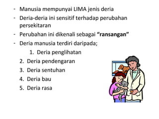 Dokumen ini membahas lima jenis deria manusia dan cara pengesanan rangsangan melalui organ deria seperti mata, telinga, hidung, kulit, dan lidah. Setiap deria memiliki struktur dan fungsi khas yang memproses rangsangan dari lingkungan. Selain itu, dokumen juga menjelaskan mengenai mekanisme pendengaran, penglihatan, serta pemahaman terhadap rangsangan dan gerak balas tubuh.