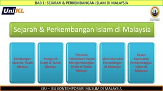 Dokumen ini membincangkan sejarah dan perkembangan Islam di Malaysia, termasuk kedatangan, pengaruh, dan penyebaran Islam di pelbagai negeri seperti Kelantan, Terengganu, Kedah, Perak, dan Melaka. Selain itu, ia juga menyentuh tentang pendidikan Islam dan institusi penting seperti JAKIM, LTH, dan BIMB, serta peranan mereka dalam memajukan Islam di negara ini. Akhir sekali, dokumen ini menyatakan struktur perundangan yang mengatur kedudukan Islam sebagai agama Persekutuan di Malaysia.