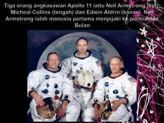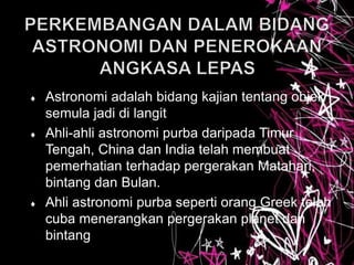 Dokumen ini menggariskan perkembangan astronomi dari pemerhatian purba hingga penerokaan angkasa lepas moden. Ia mencatat sumbangan penting ahli astronomi dan evolusi teknologi seperti roket, satelit, dan kapal angkasa. Selain itu, ia menerangkan bagaimana satelit digunakan untuk pelbagai kajian bumi dan angkasa serta meramalkan fenomena cuaca.