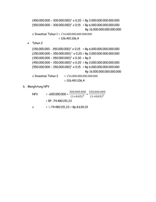 Dokumen tersebut berisi soal-soal latihan tentang analisis risiko investasi pada beberapa proyek. Terdapat tiga soal yang masing-masing meminta perhitungan nilai yang diharapkan, deviasi standar, dan NPV beberapa proyek beserta pemilihan proyek yang paling layak berdasarkan analisis tersebut.